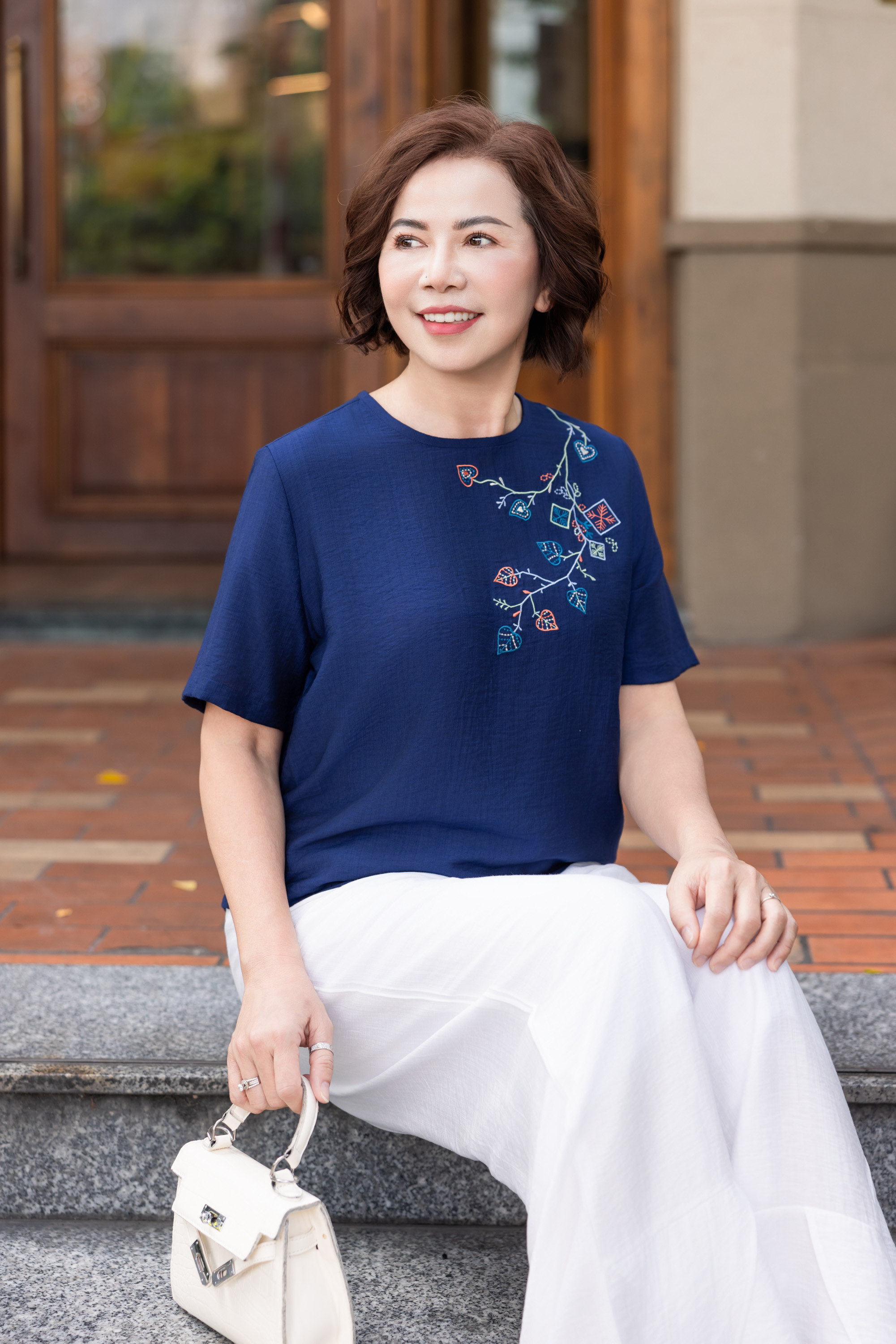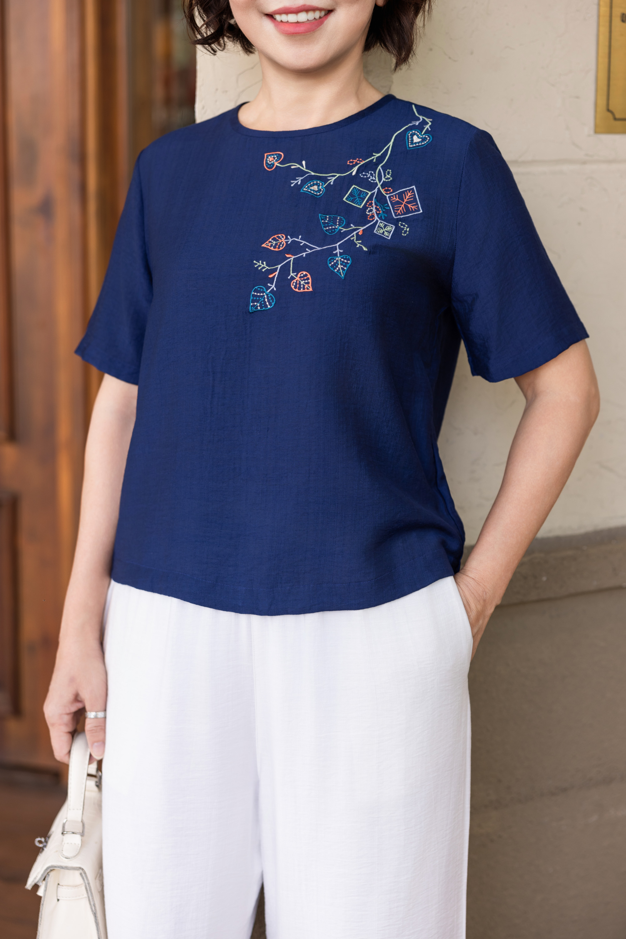 M COLLECTION | Áo Kiểu Nữ Trung Niên Tặng Mẹ, Bà Vải Lụa Thêu Hoa Hè Mát Mẻ Cổ Tròn Tay Ngắn A12296LW01