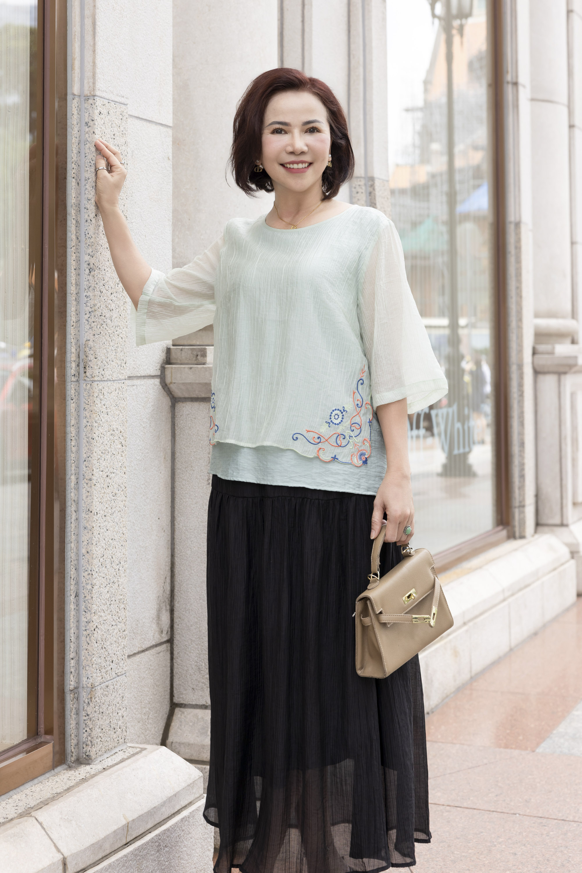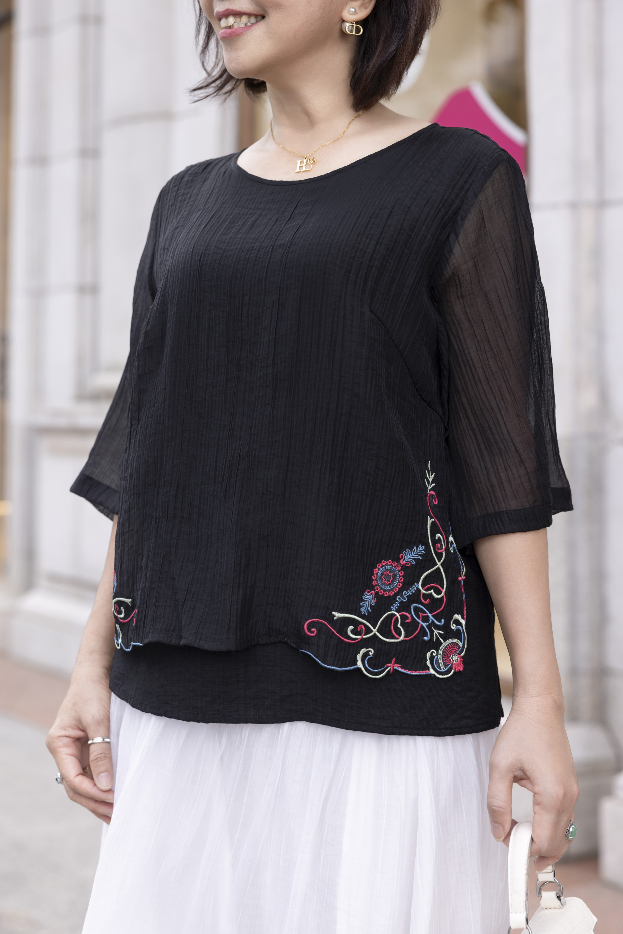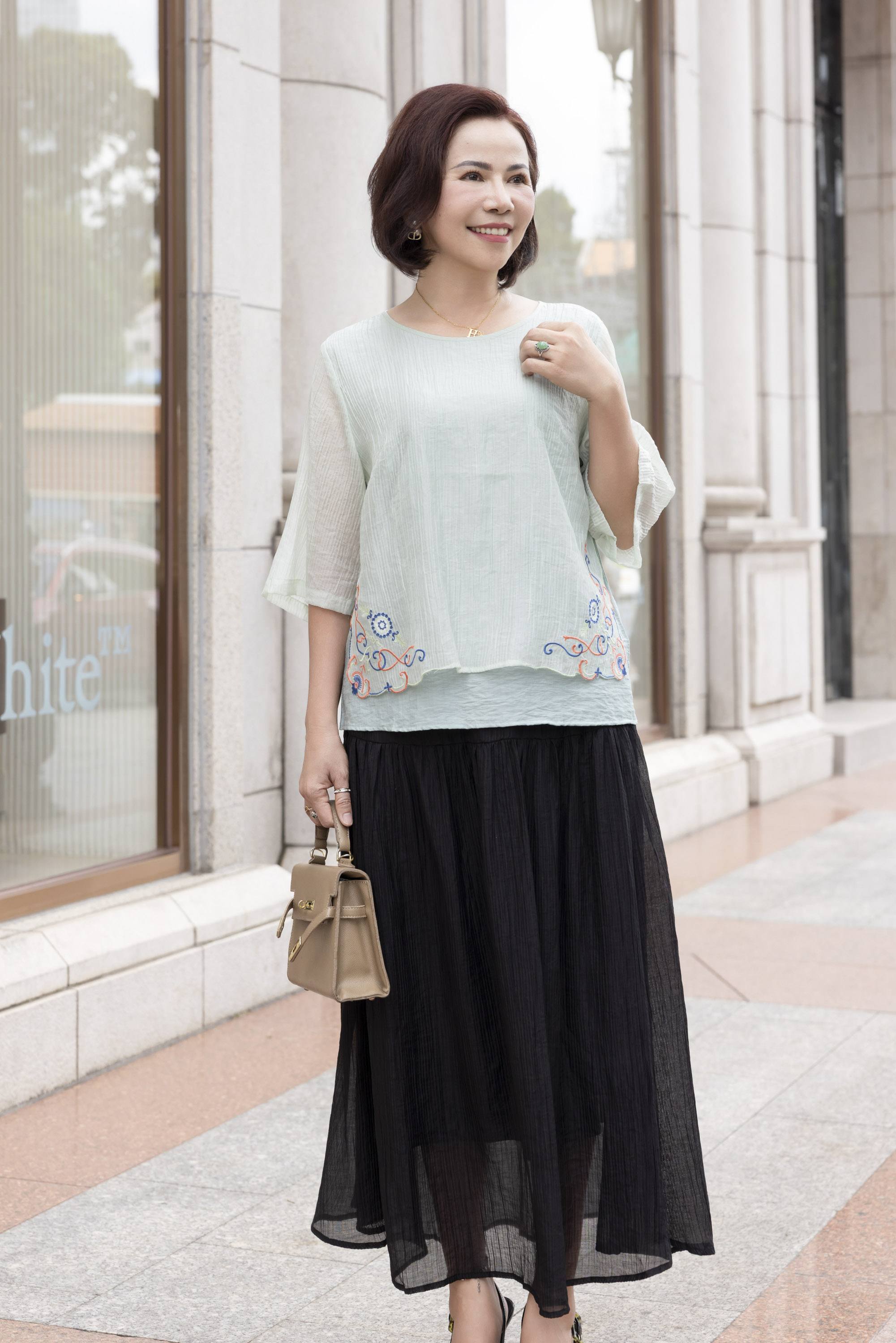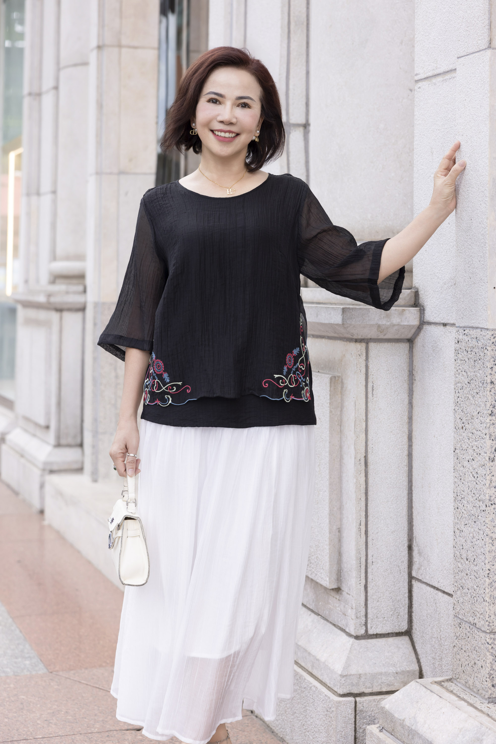 M COLLECTION | Áo Kiểu Nữ Trung Niên Tặng Mẹ Tơ Dập Ly Có Lót Thêu Hoa Tay Lỡ Xếp Tầng Xẻ Tà A12886LW01