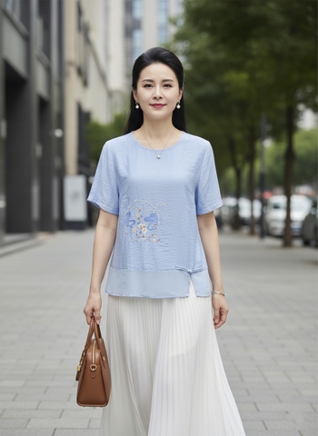 M COLLECTION | Áo Kiểu Nữ Trung Niên Tặng Mẹ Bà Chất Vải Lụa Hàn Thêu Hoa Cổ Tròn Tay Ngắn A12342