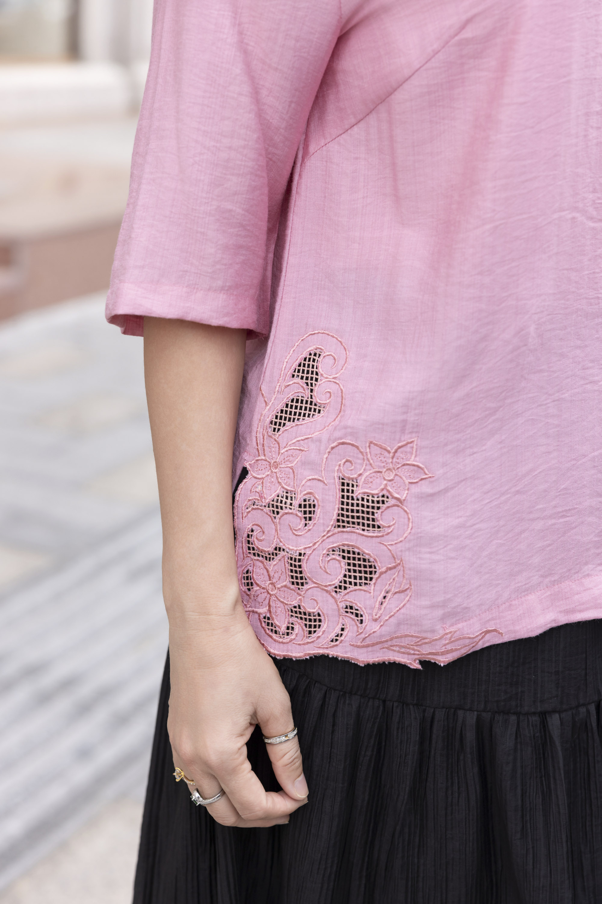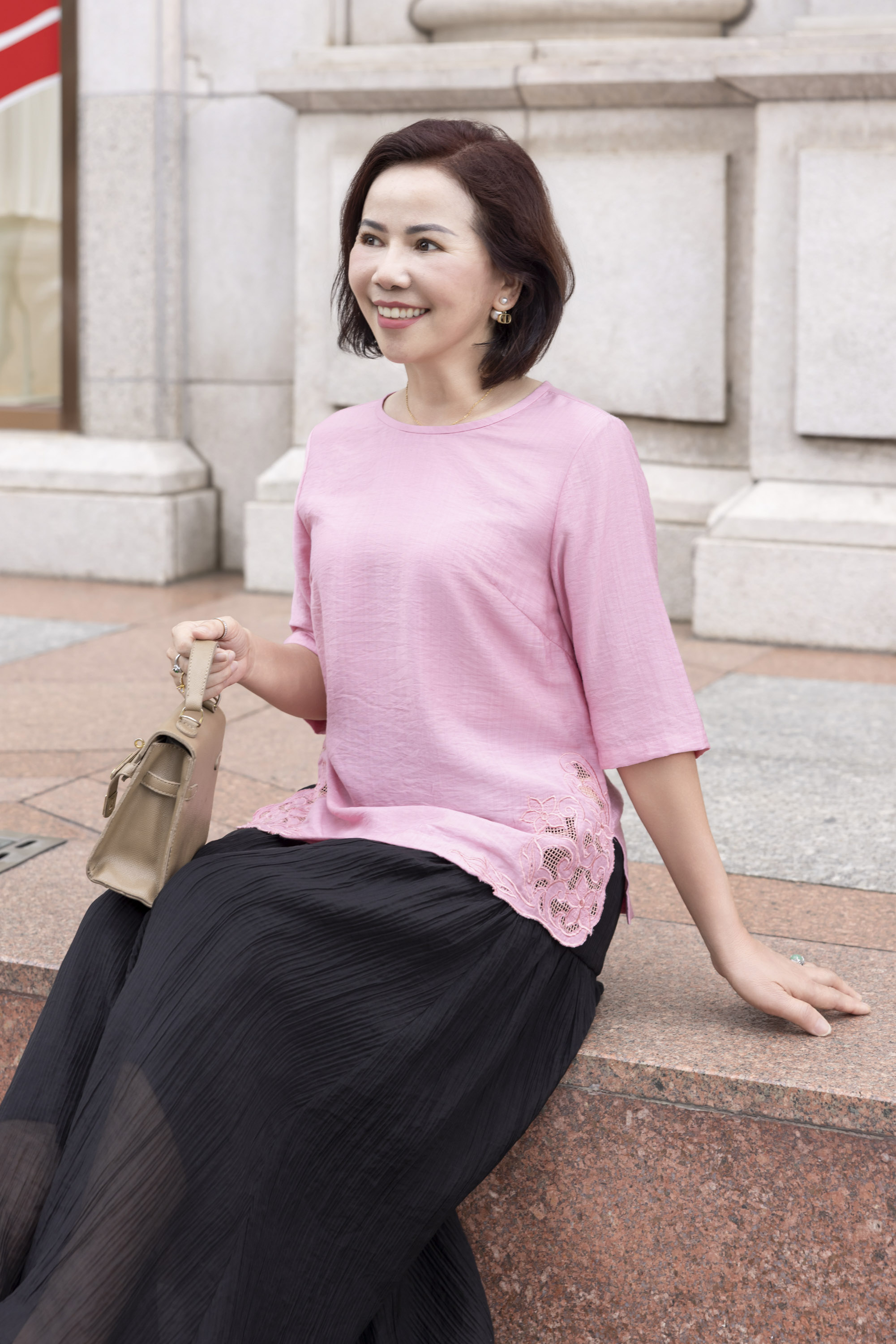 M COLLECTION | Áo Kiểu Nữ Trung Niên Tặng Mẹ Lụa Hàn Thêu Hoa Ren Lưới Cổ Tròn Tay Lỡ Xẻ Tà A12539LW01