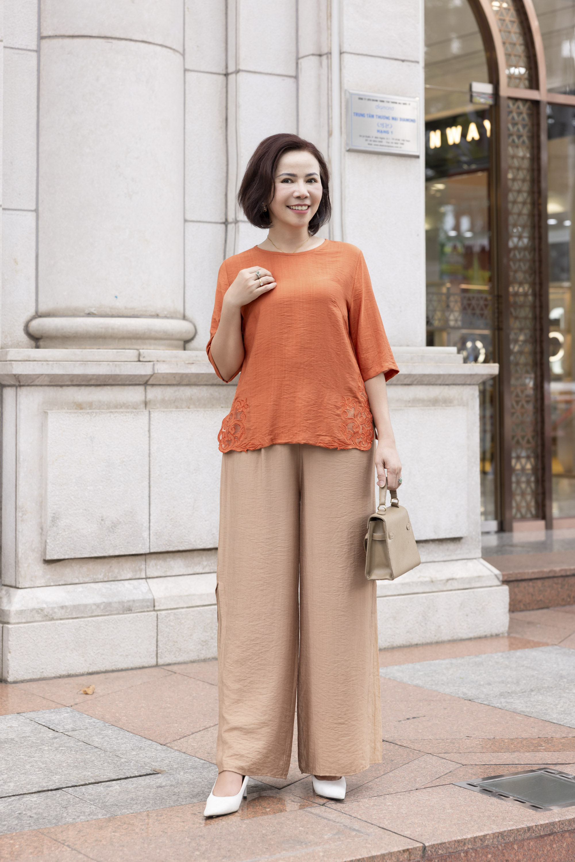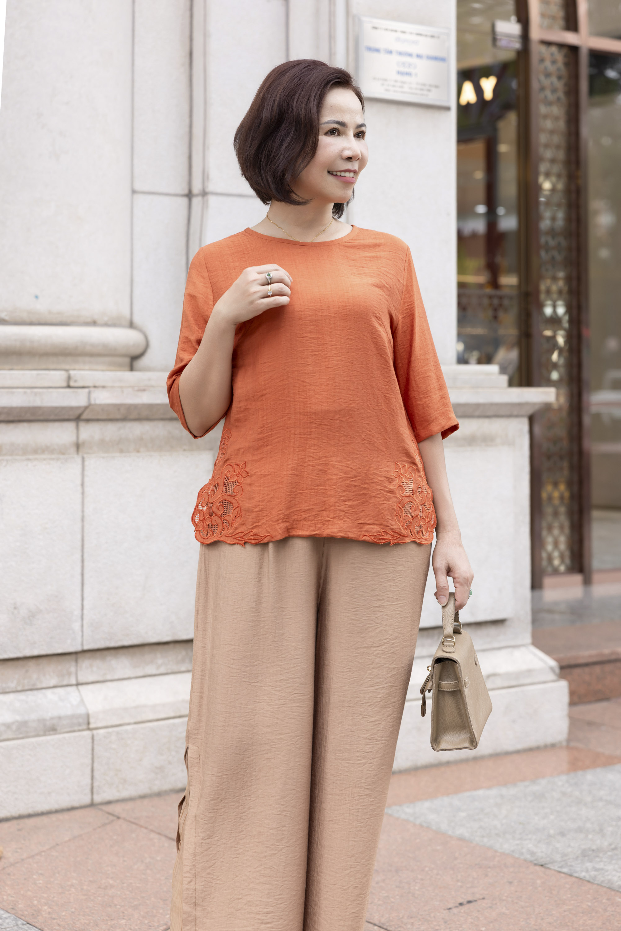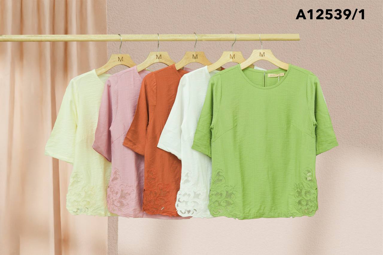 M COLLECTION | Áo Kiểu Nữ Trung Niên Tặng Mẹ, Bà Vải Lụa Thêu Hoa Hè Mát Mẻ Cổ Tròn Tay Ngắn A12296LW01