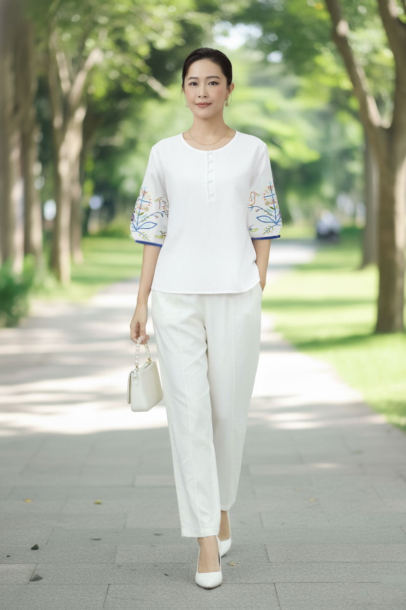 M COLLECTION | Áo Kiểu Nữ Trung Niên Tặng Mẹ, Bà Cổ Tròn Cài Nút Vải Linen Thêu Hoa Tay Lỡ A13037LW01