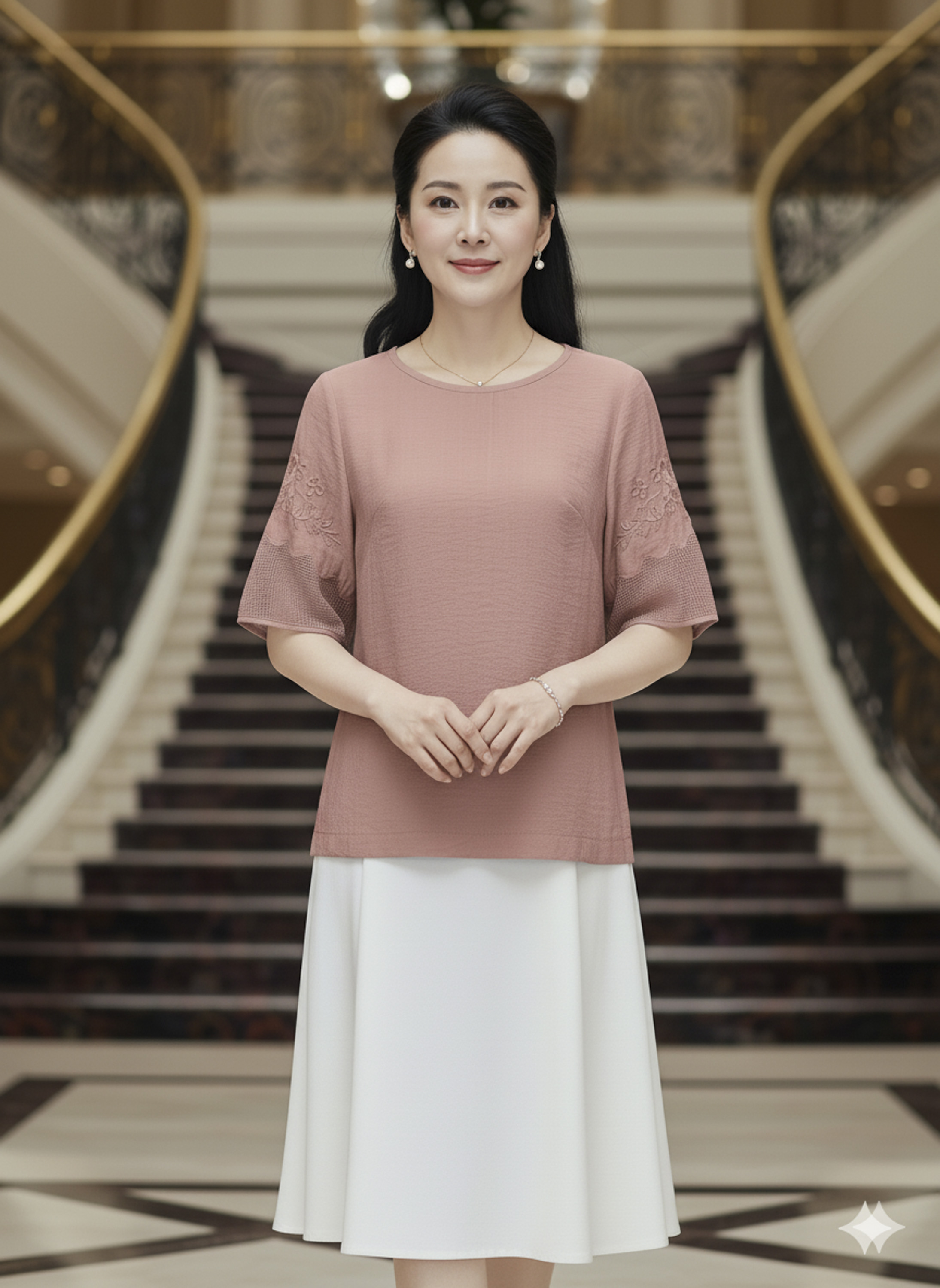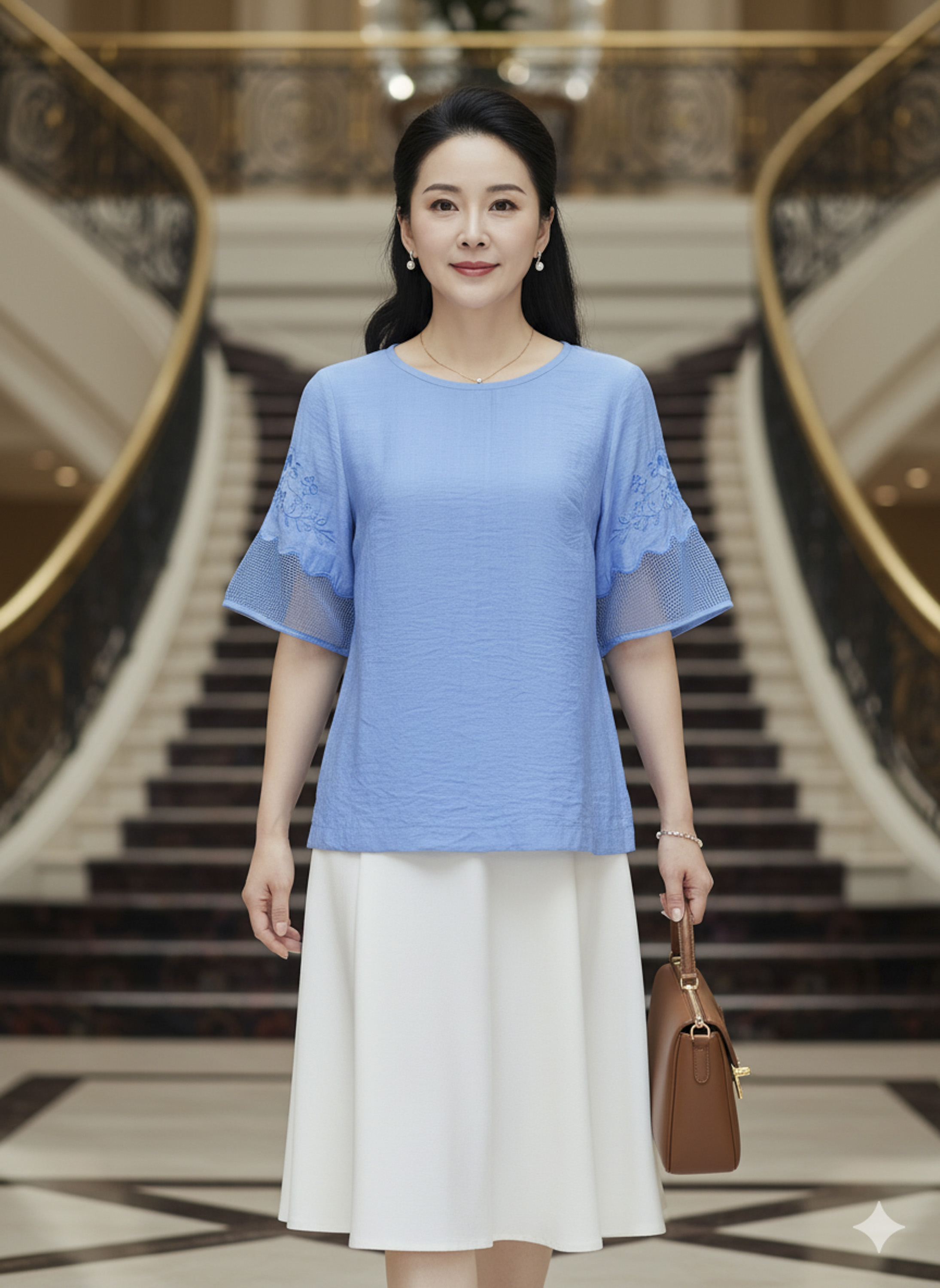 M COLLECTION | Áo Kiểu Nữ Trung Niên Tặng Mẹ Cổ Tròn Vải Lụa Hàn Thêu Hoa Phối Tay Lưới A10957