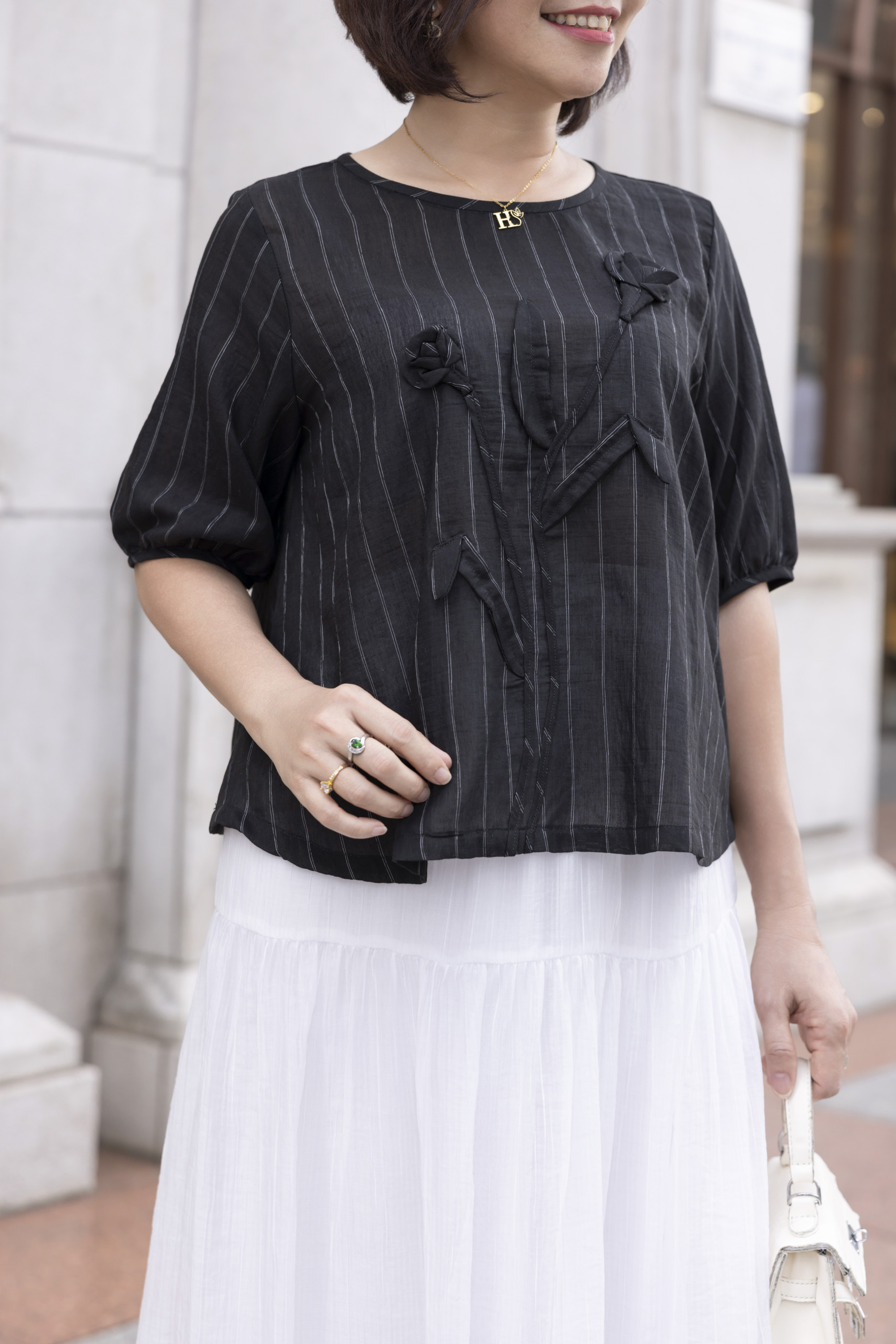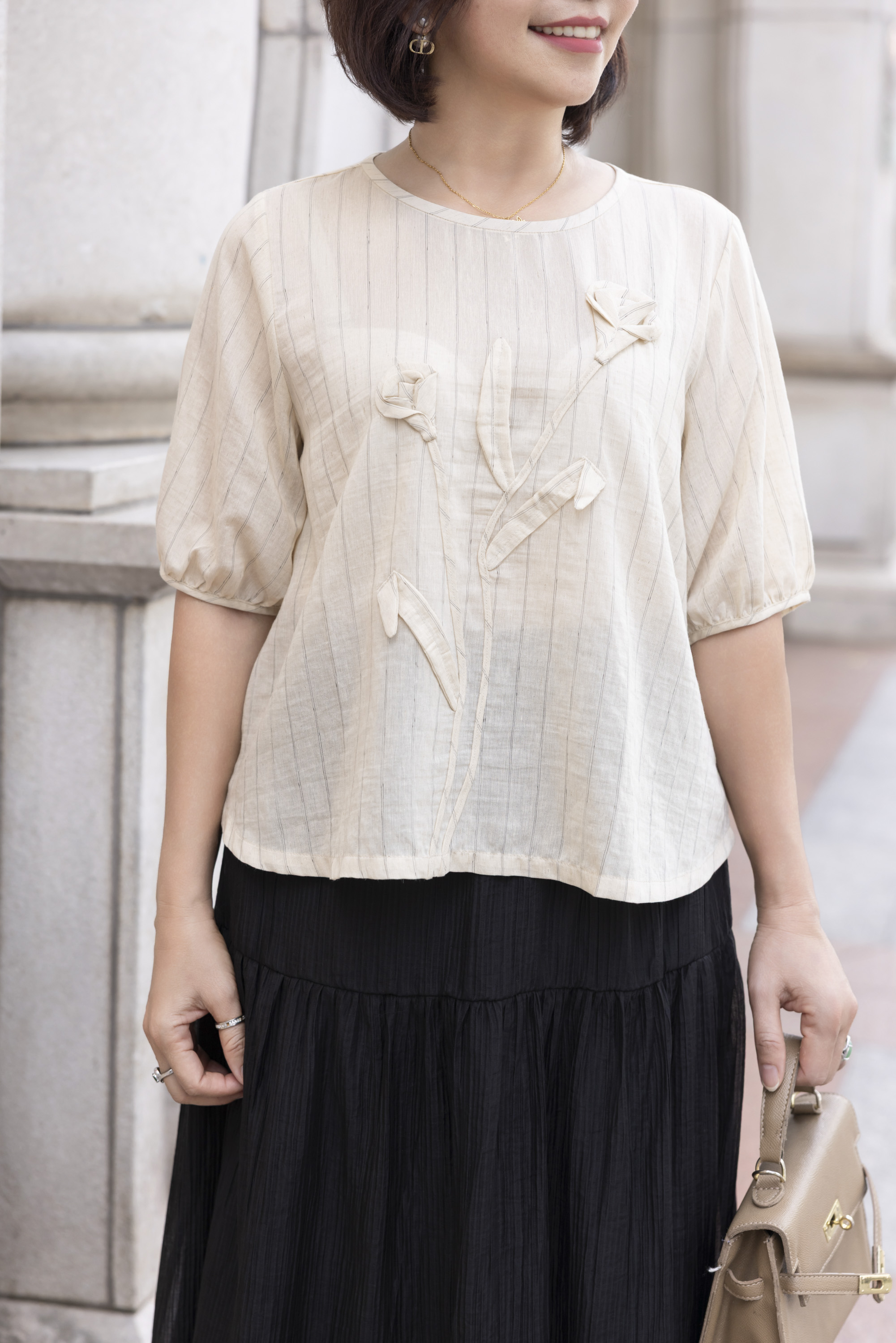 M COLLECTION | Áo Kiểu Nữ Trung Niên Tặng Mẹ, Bà Cổ Tròn Tay Bo Bí Lỡ Vải Linen Đính Hoa 3D A11984LW01