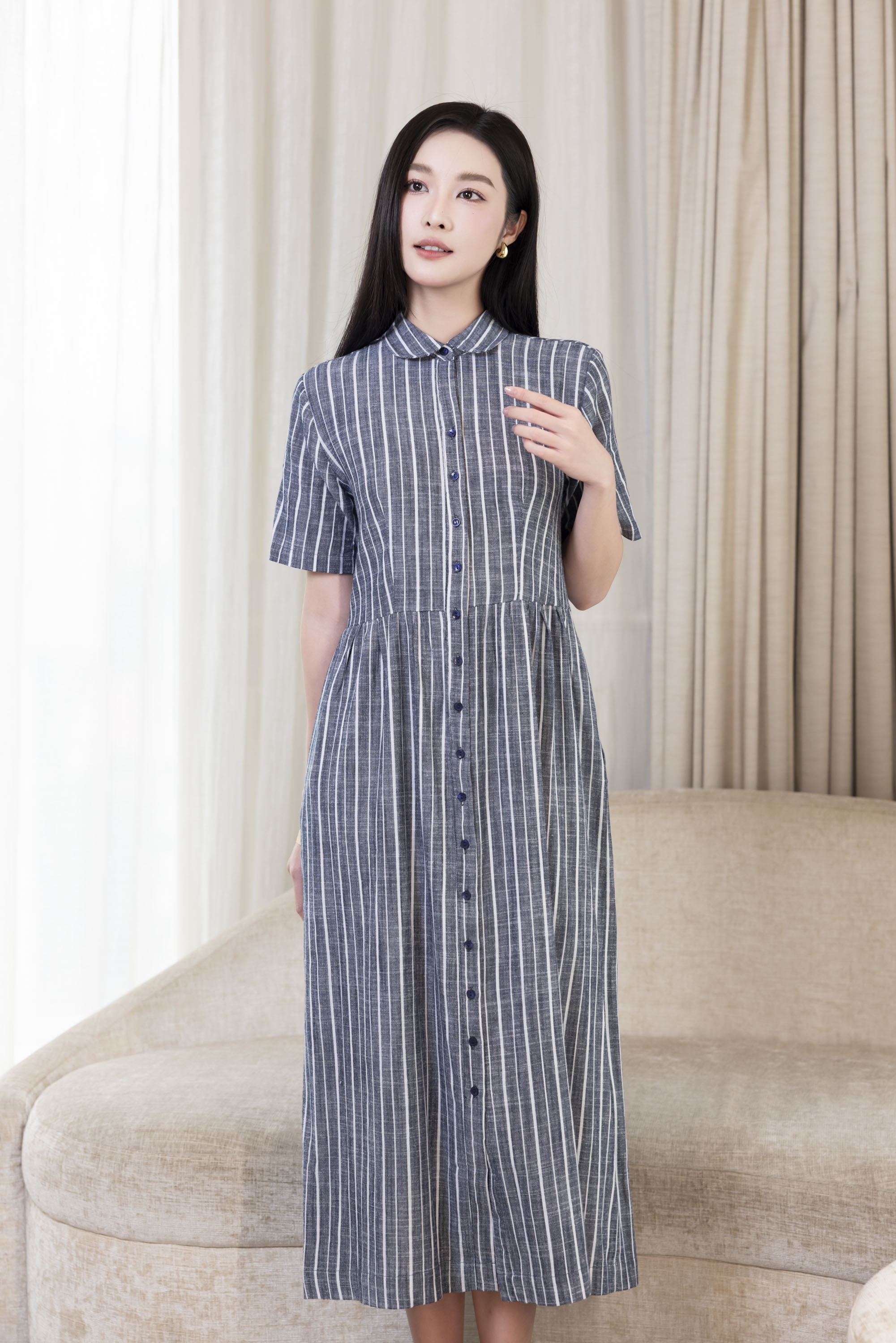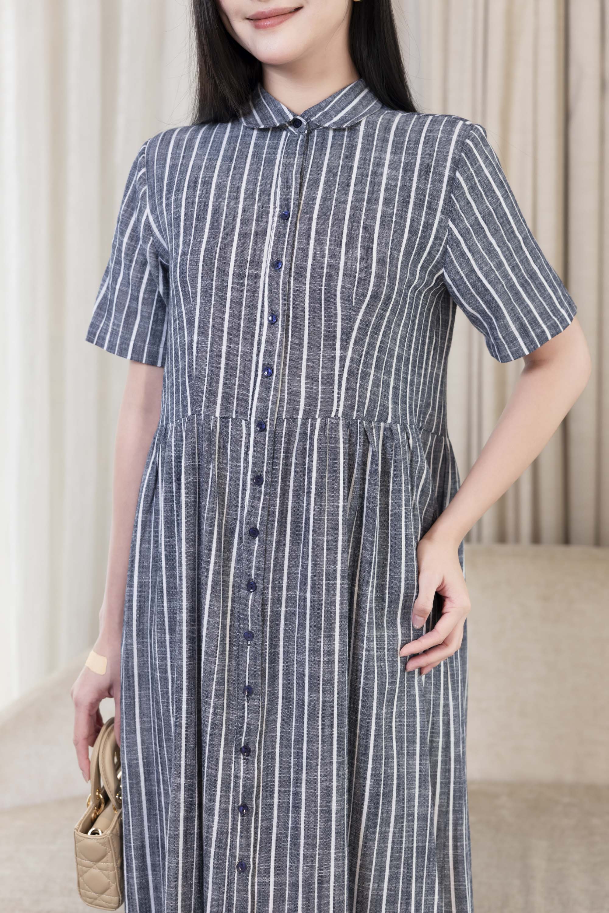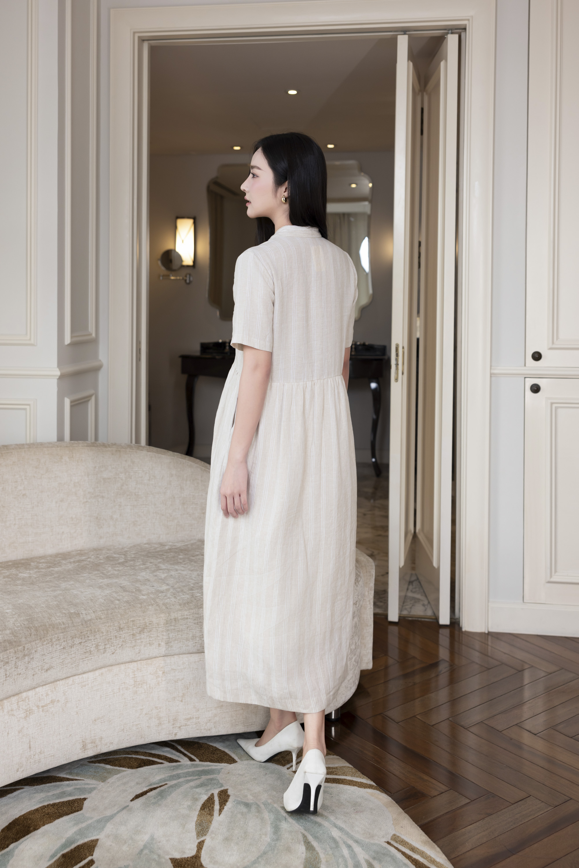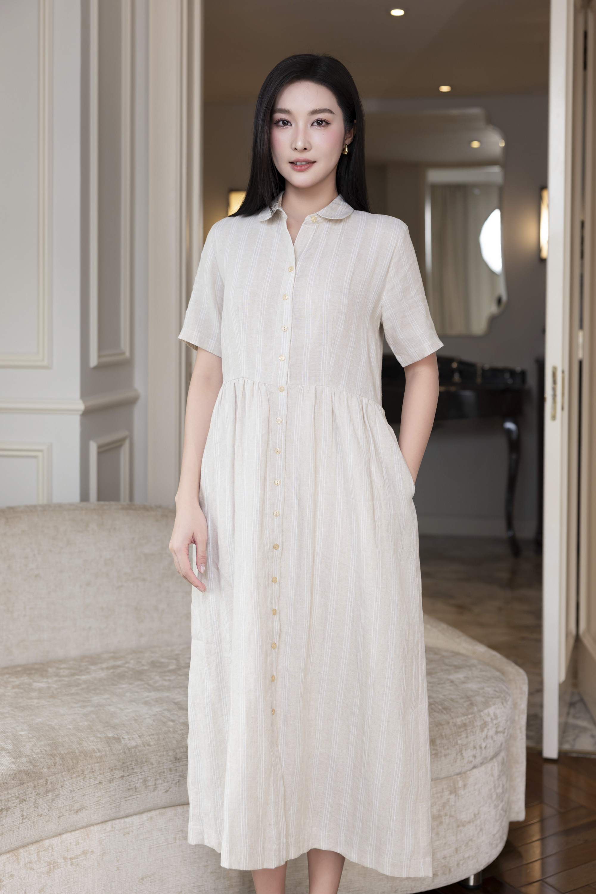 SWANLAKE | Váy Đầm Sơ Mi Nữ Midi Suông Cài Nút Sọc Dọc Nhấn Eo Xếp Ly Công Sở Linen Có Túi D12498LW02