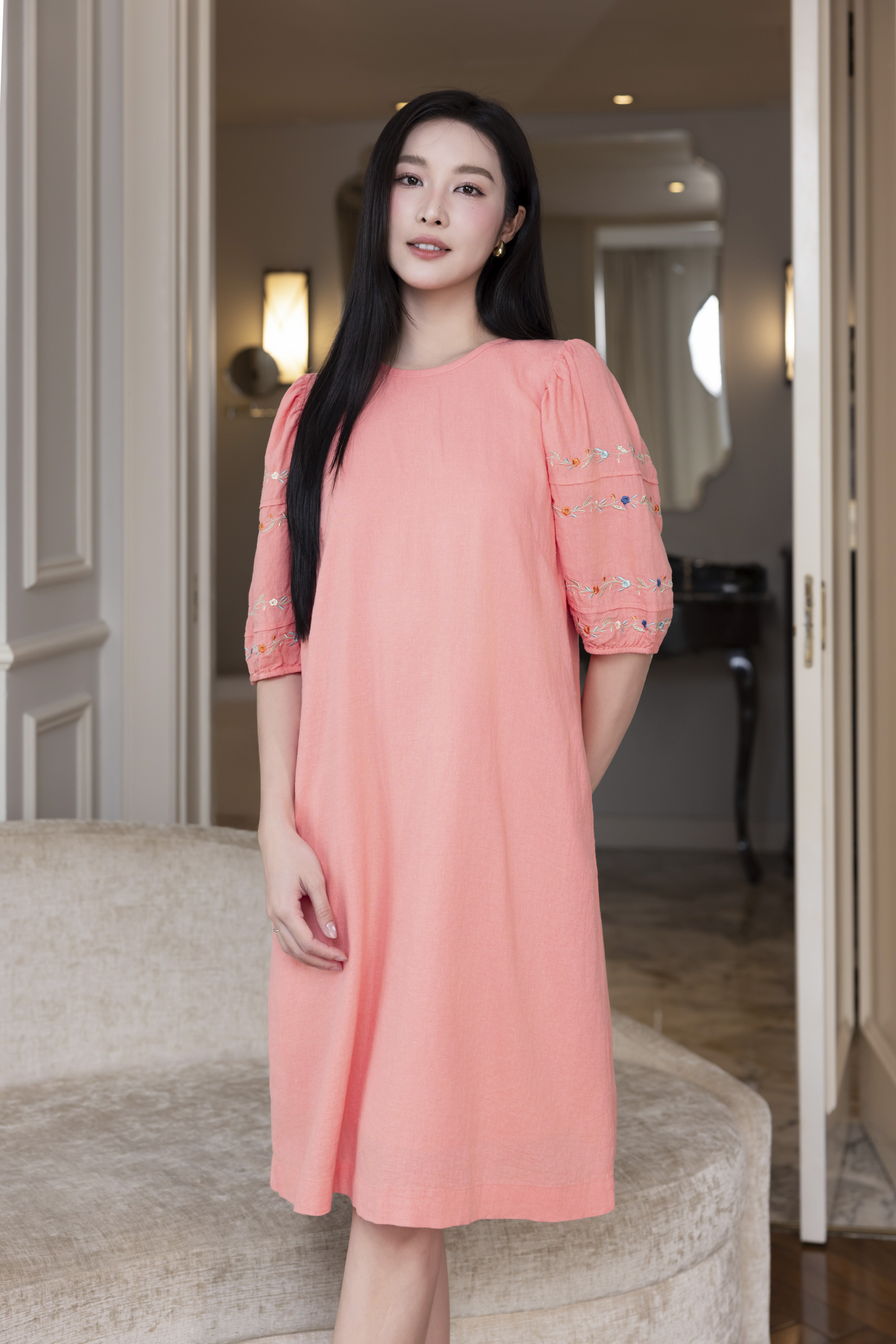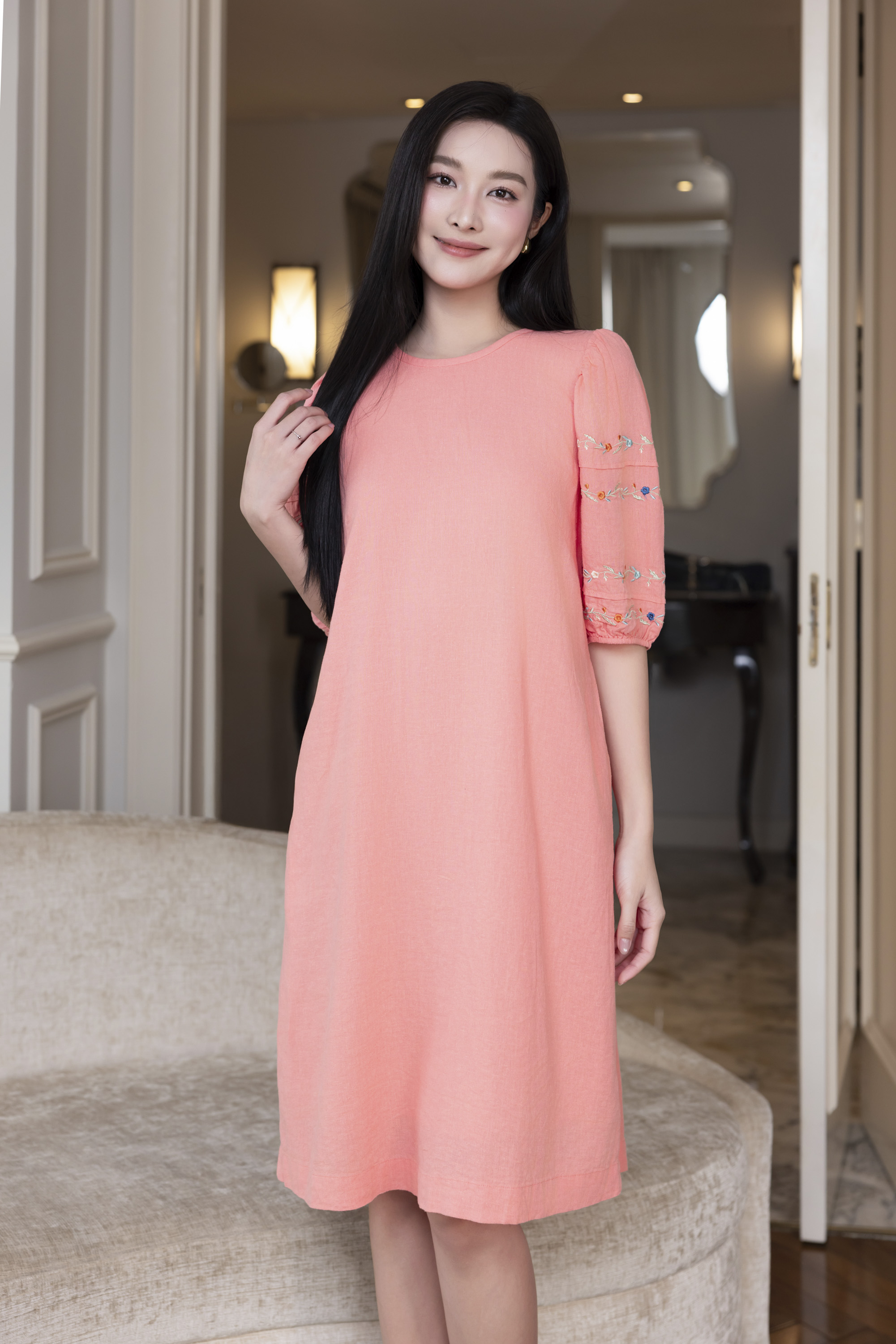SWANLAKE | Váy Đầm Nữ Suông Vải Linen Tay Bí Lỡ Thêu Hoa Cổ Tròn Có Túi Công Sở Thanh Lịch D12768LW01