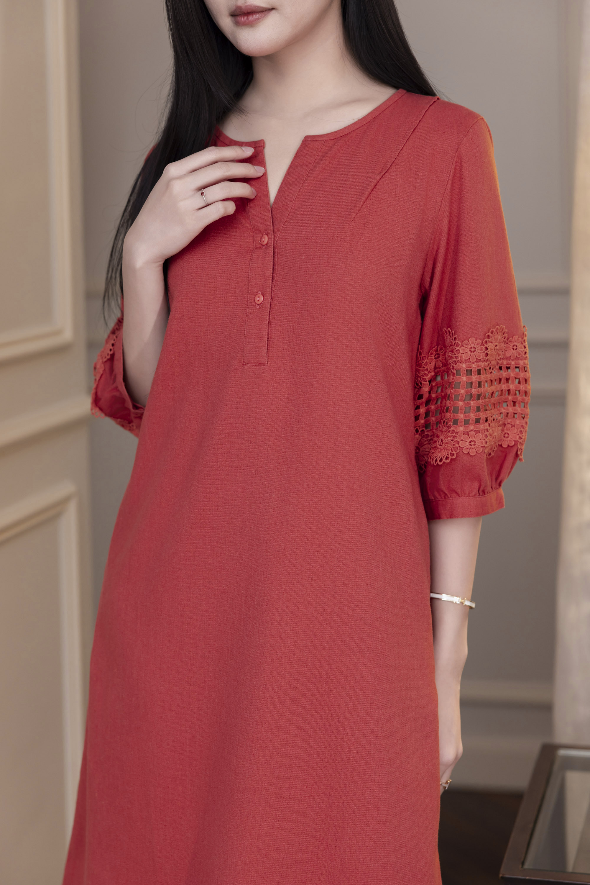 SWANLAKE | Váy Đầm Nữ Suông Cổ Trụ Cài Nút Vải Linen Tay Lỡ Phồng Thêu Hoa Phối Lưới Công Sở D12815LW01