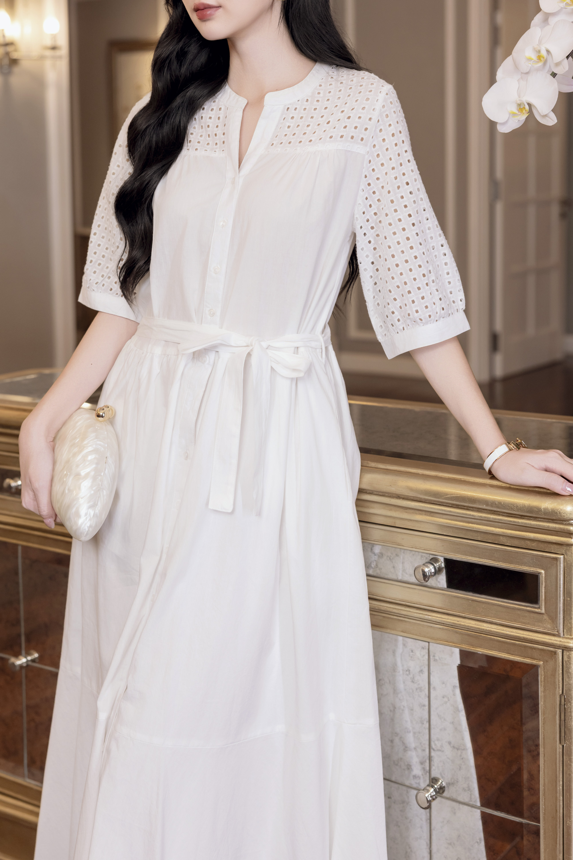 SWANLAKE | Váy Đầm Nữ Maxi Sơ Mi Suông Đuôi Cá Xòe Cotton Thêu Hoa Đục Lỗ Cài Nút Tay Nẹp Lỡ D12901LW01