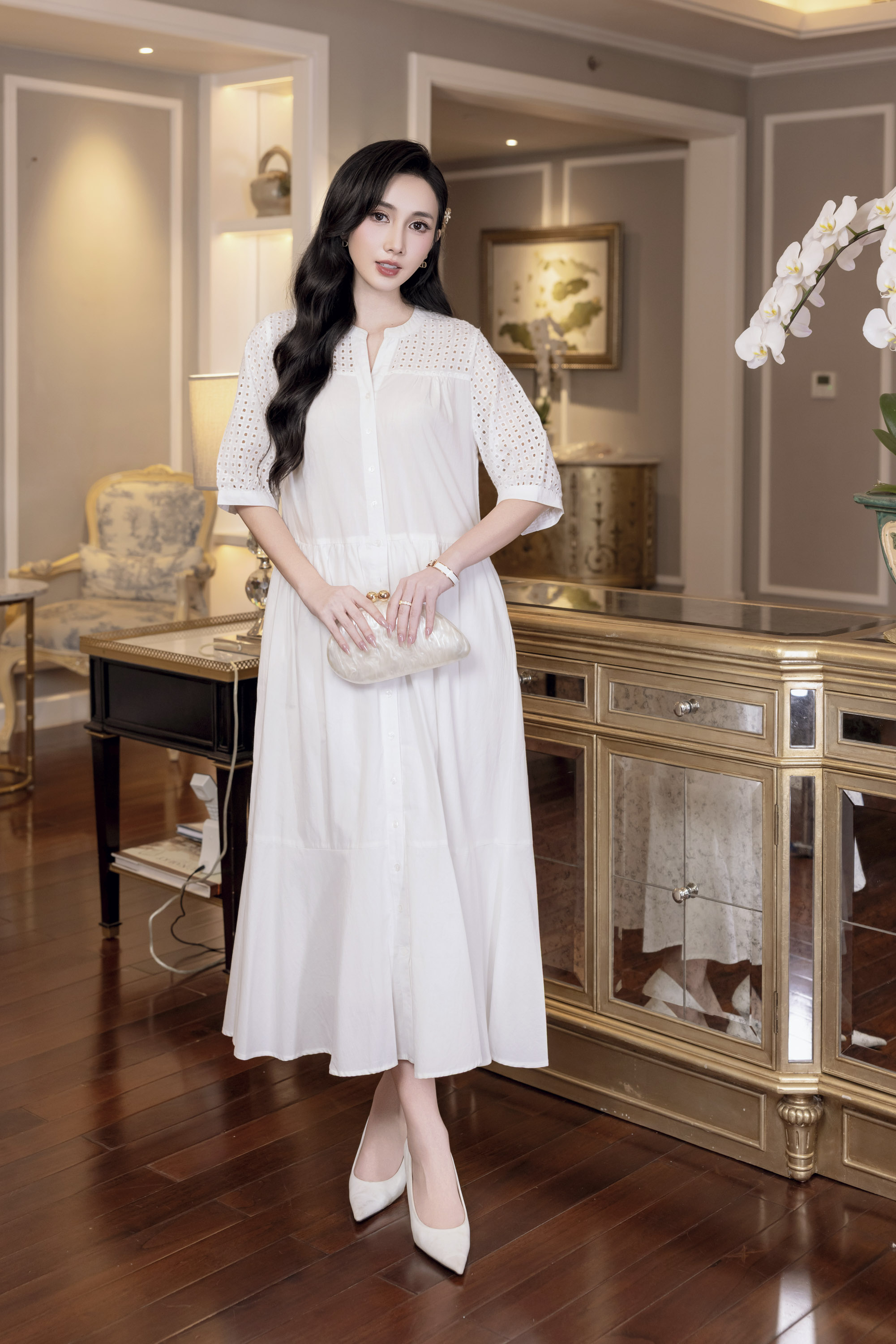 SWANLAKE | Váy Đầm Nữ Maxi Đuôi Cá Babydoll Cotton Thêu Đục Lỗ Trơn Cổ Trụ Cài Nút Tay Dài Hè D12394LW07