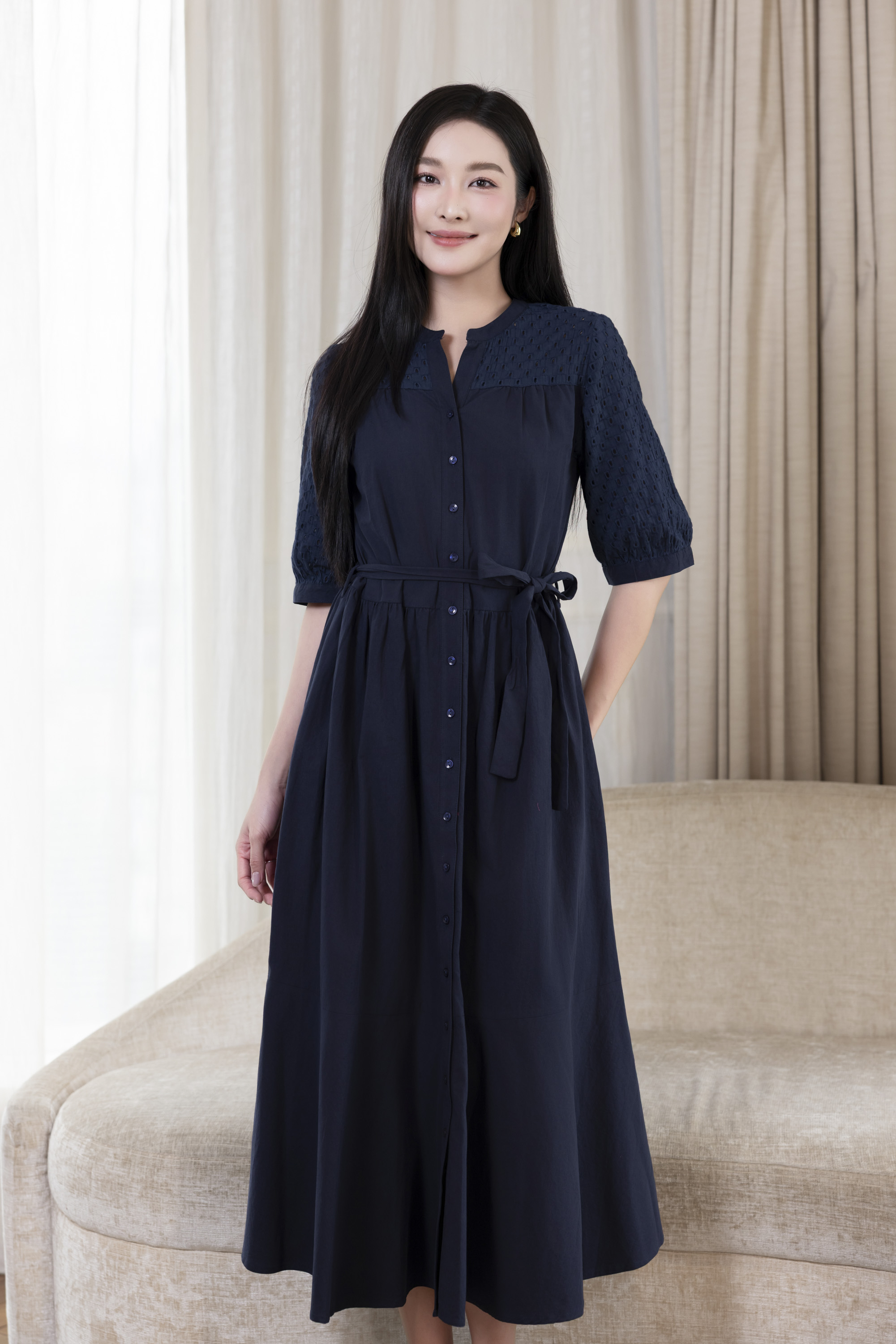 SWANLAKE | Váy Đầm Nữ Maxi Suông Cổ Trụ Cài Nút Cotton Phối Ren Dây Thắt Eo Tay Lỡ Công Sở D12821LW01