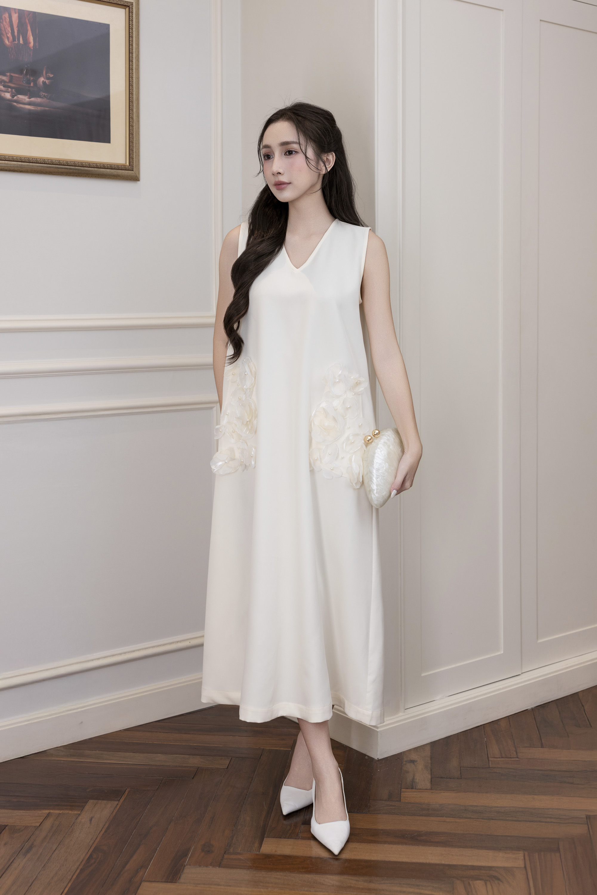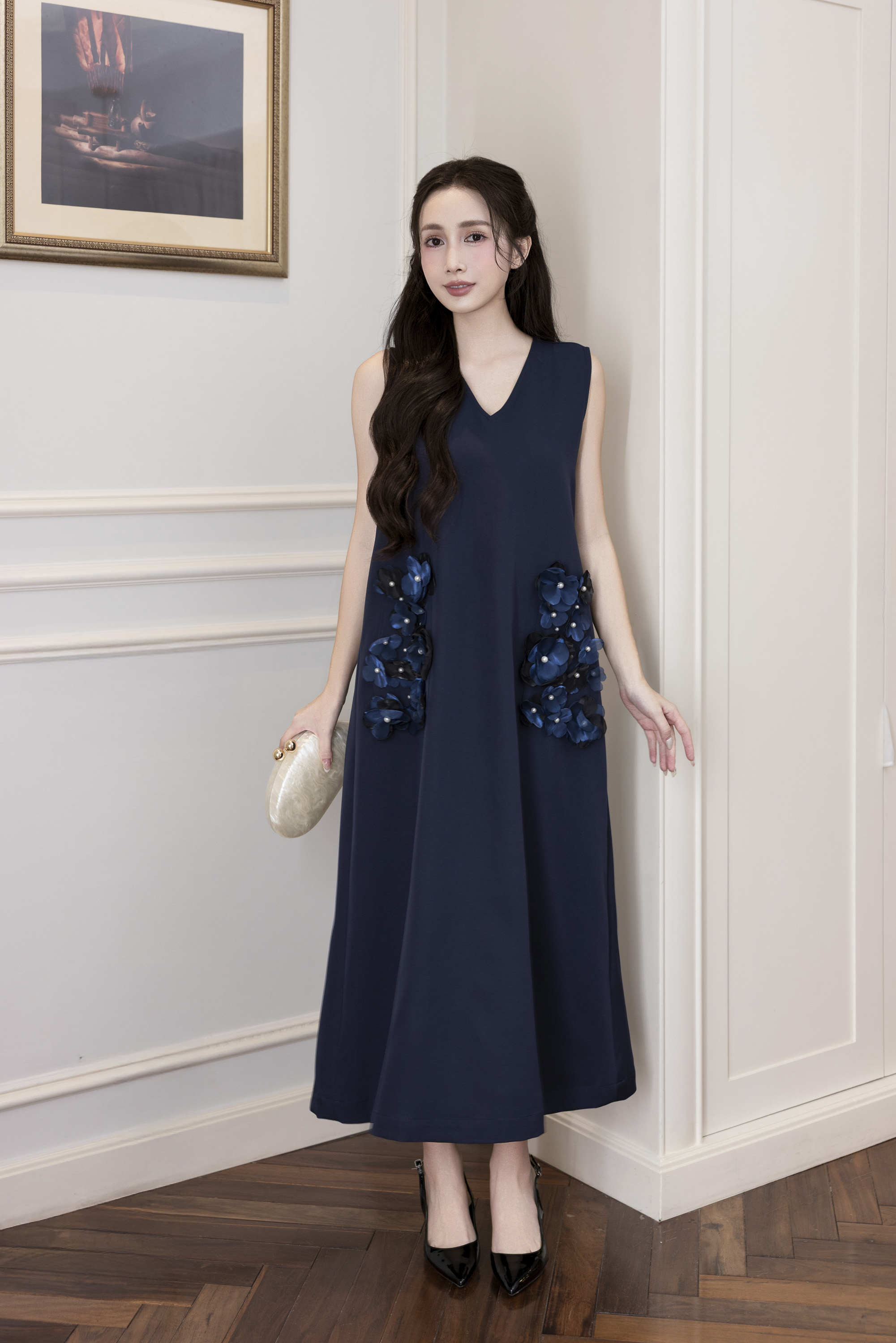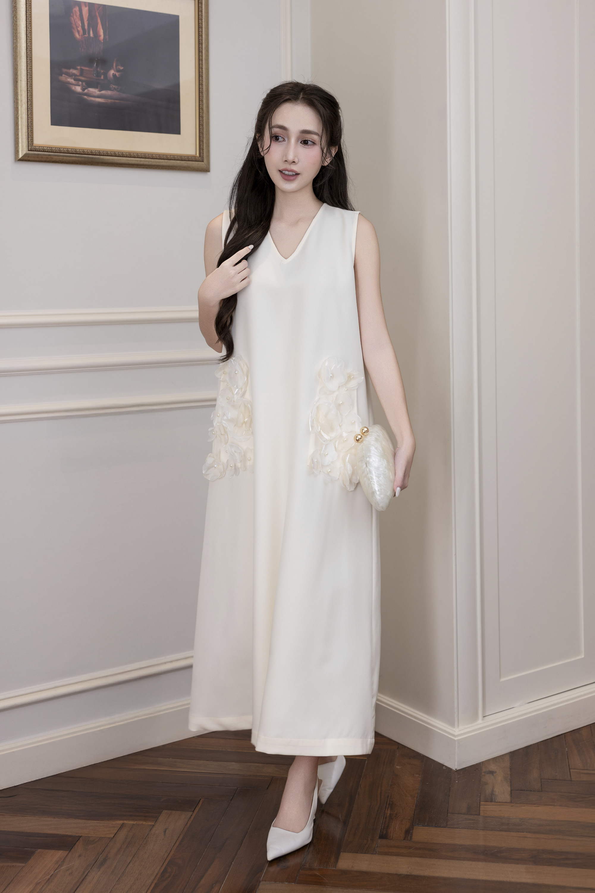 Váy Đầm Nữ Maxi Suông Sát Nách Cổ Tim Lụa Dày Đính Hoa 3D Sang Trọng Đi Tiệc - D12880LW01