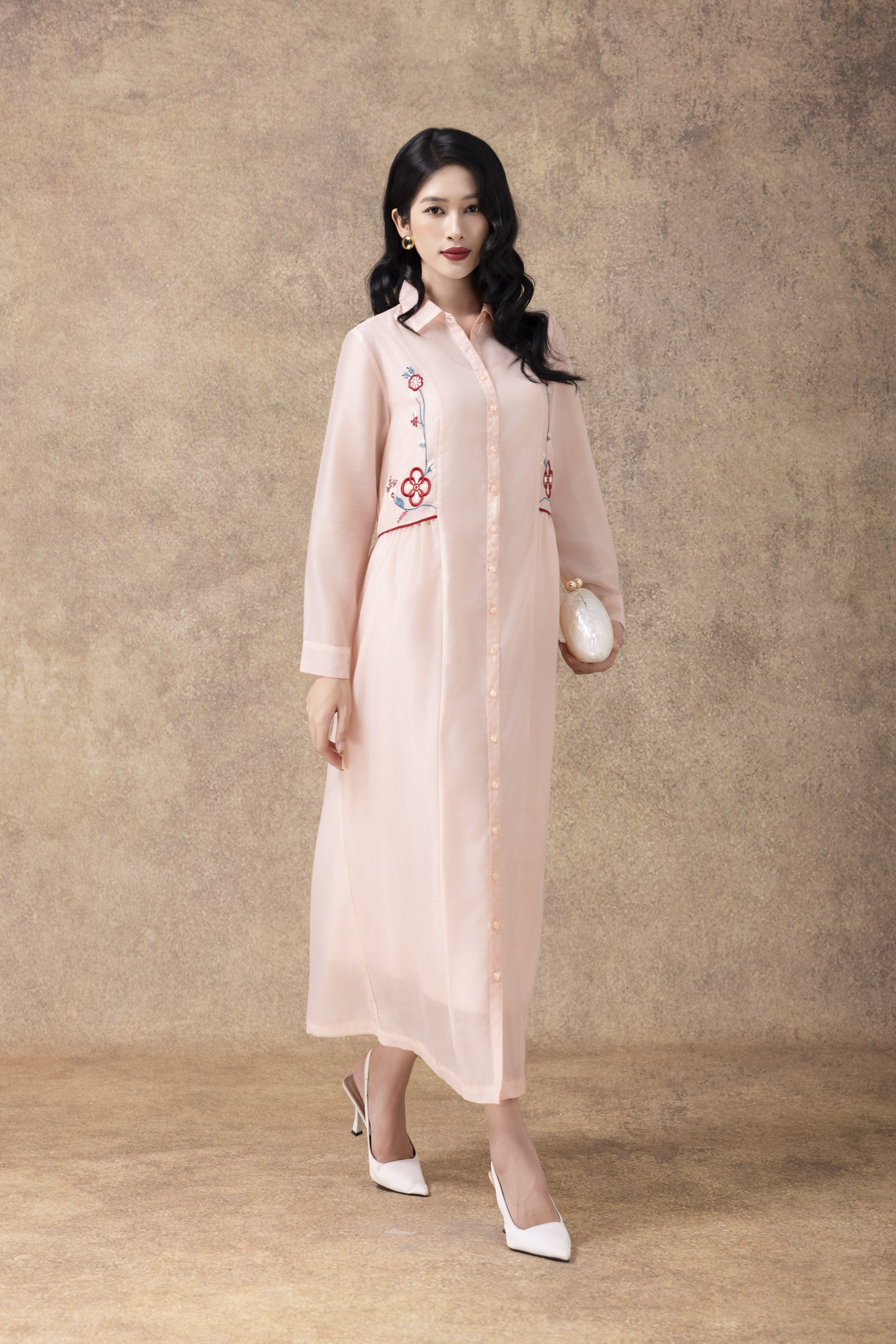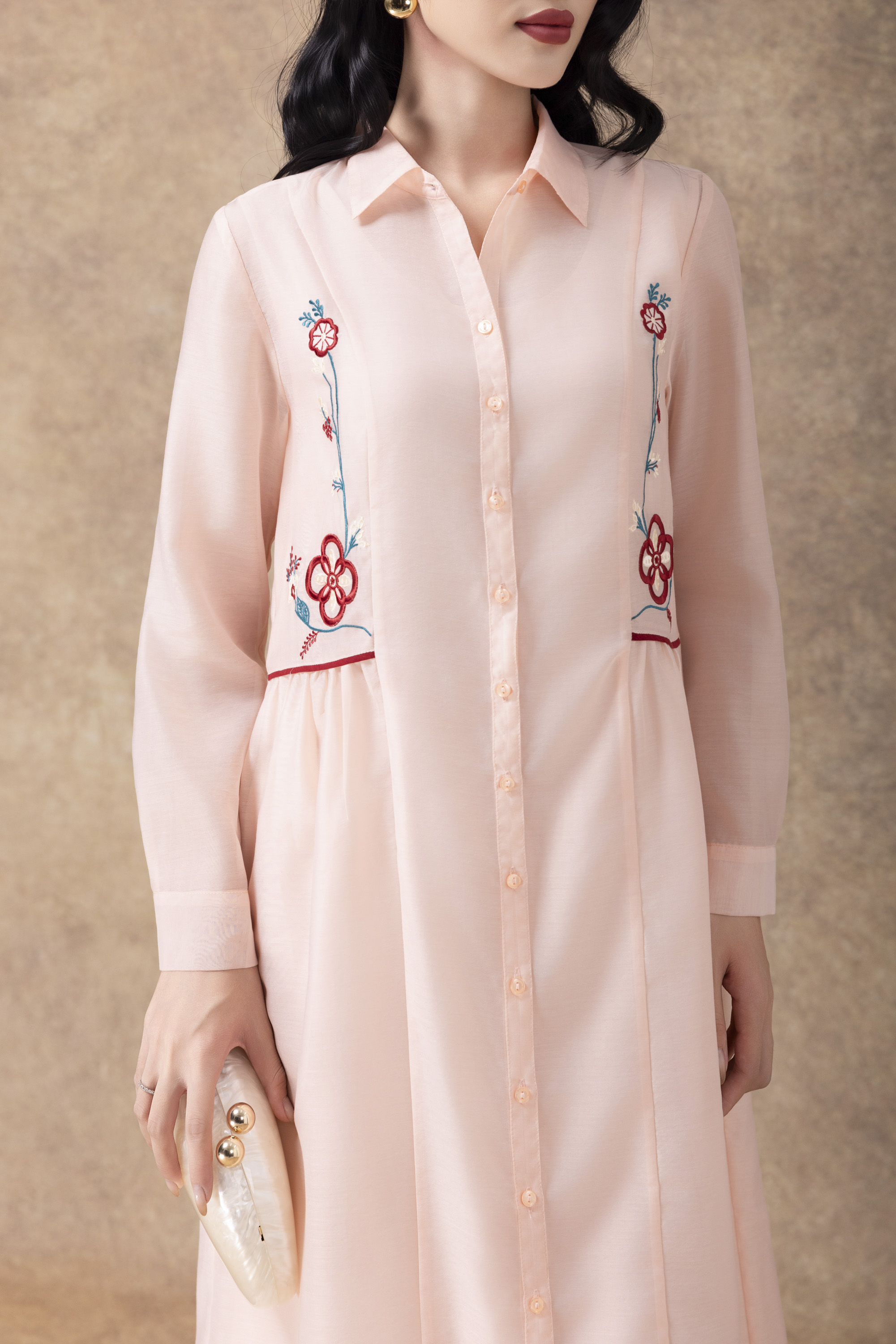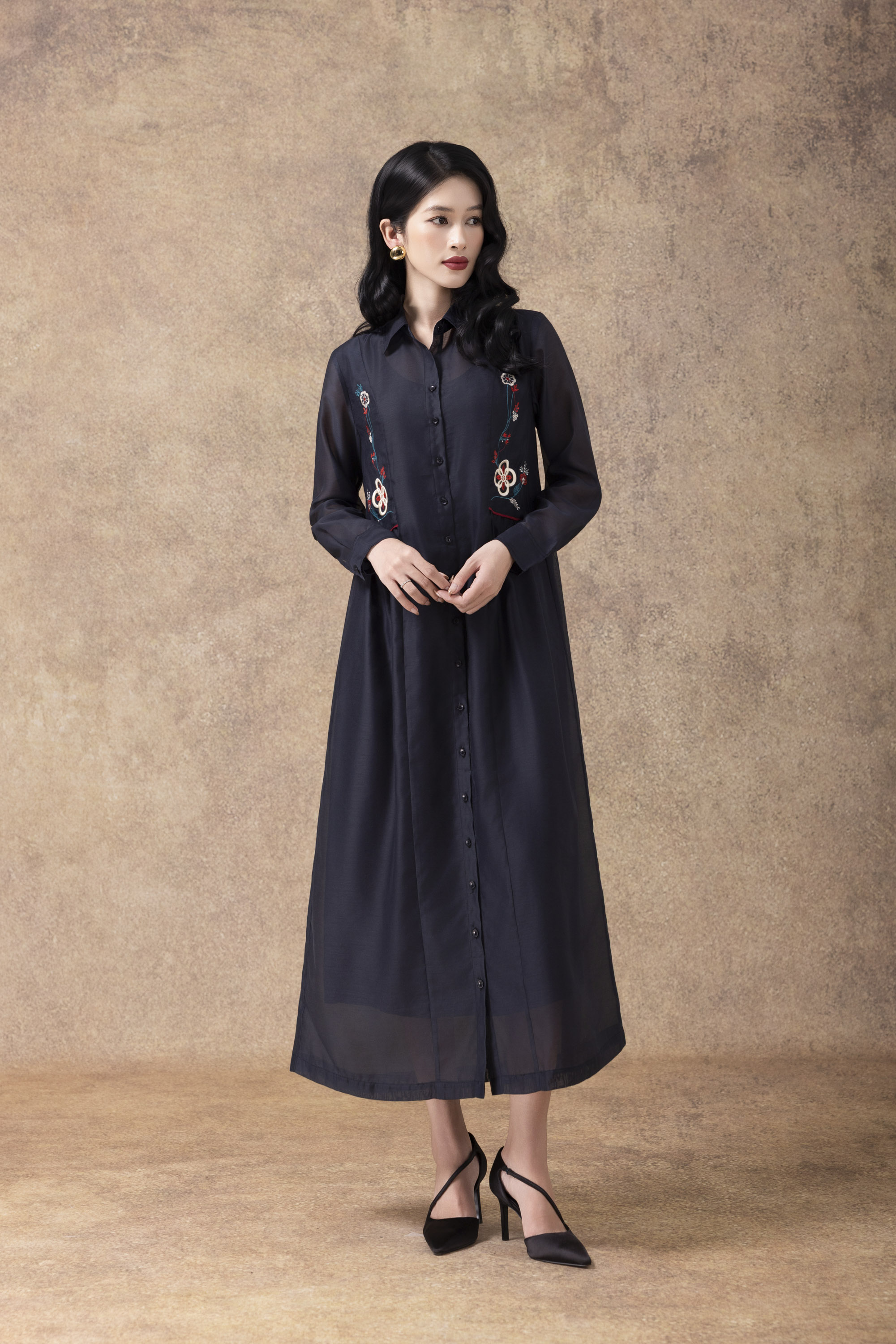 SWANLAKE | Váy Đầm Sơ Mi Nữ Suông Vải Tơ Lót Lụa Thêu Hoa Cao Cấp Tay Dài Công Sở Thanh Lịch D13096LW01