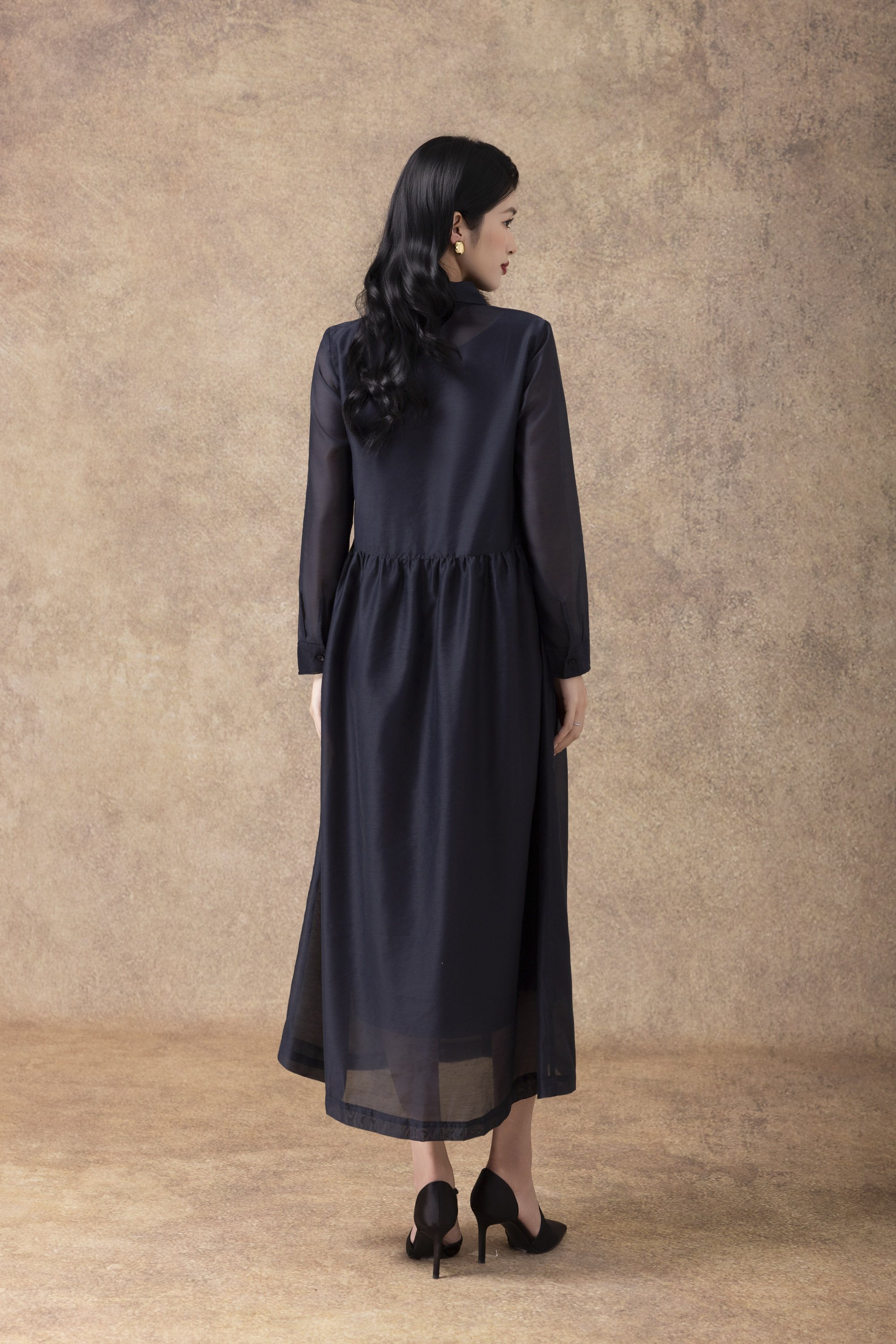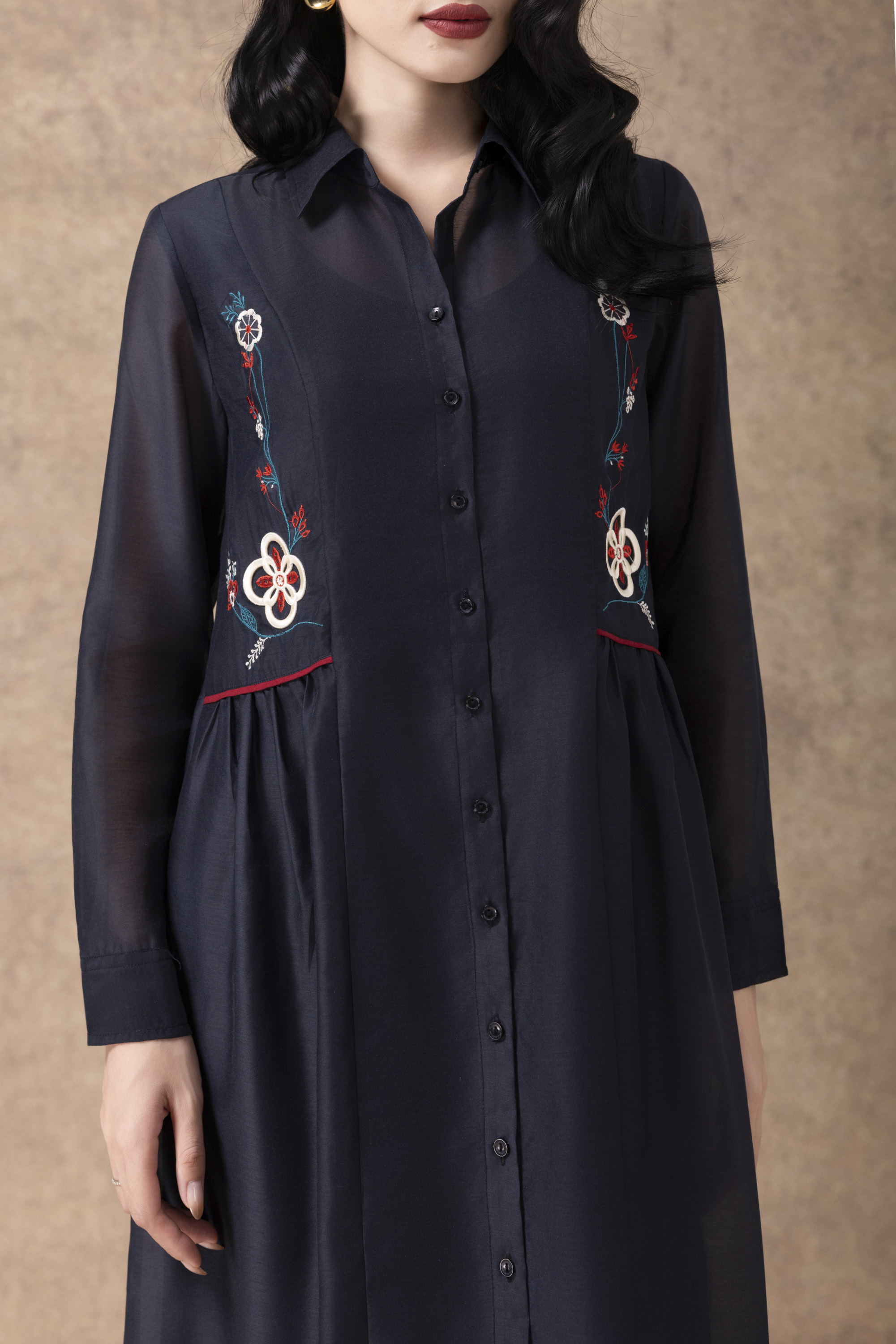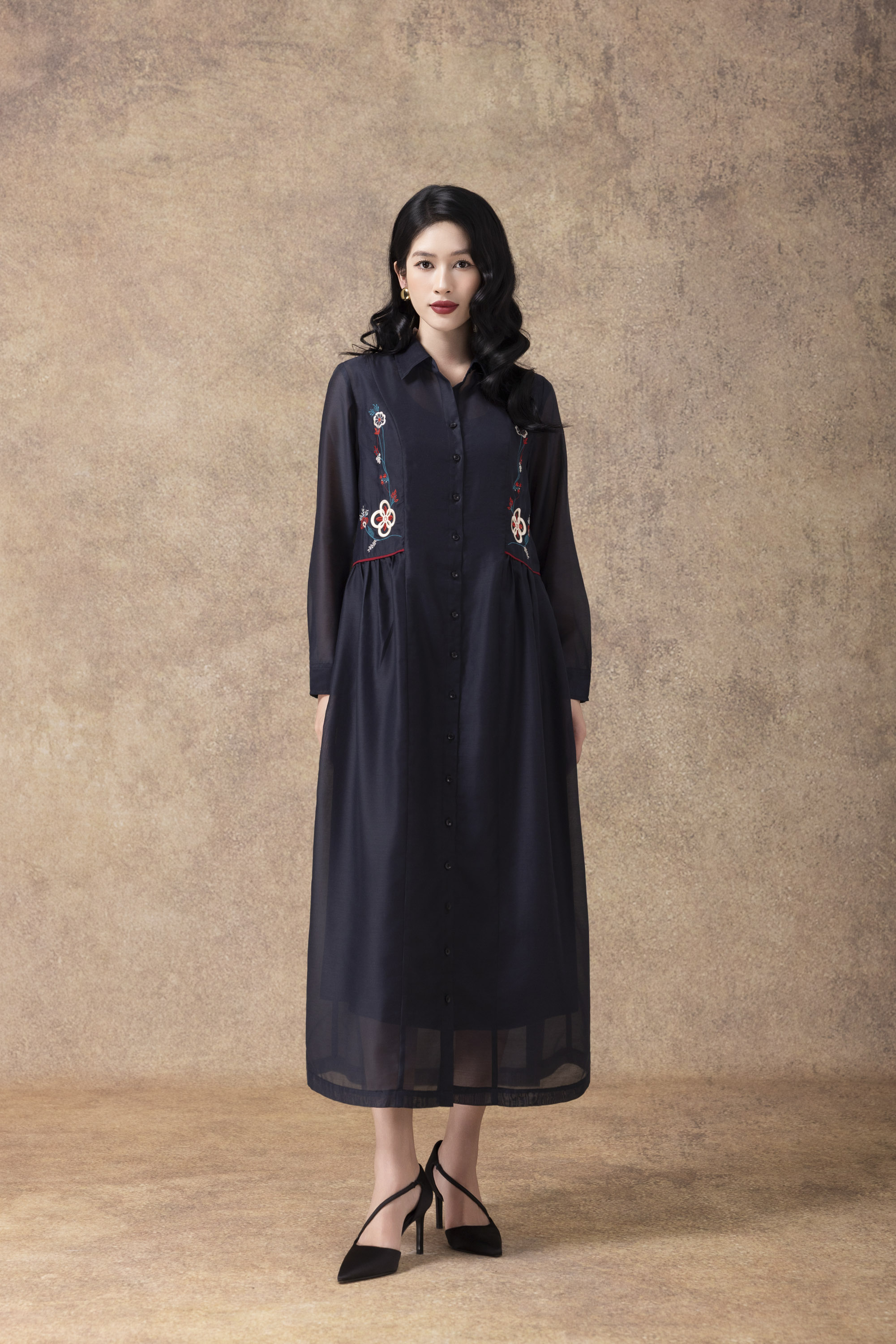 SWANLAKE | Váy Đầm Sơ Mi Nữ Suông Vải Tơ Lót Lụa Thêu Hoa Cao Cấp Tay Dài Công Sở Thanh Lịch D13096LW01