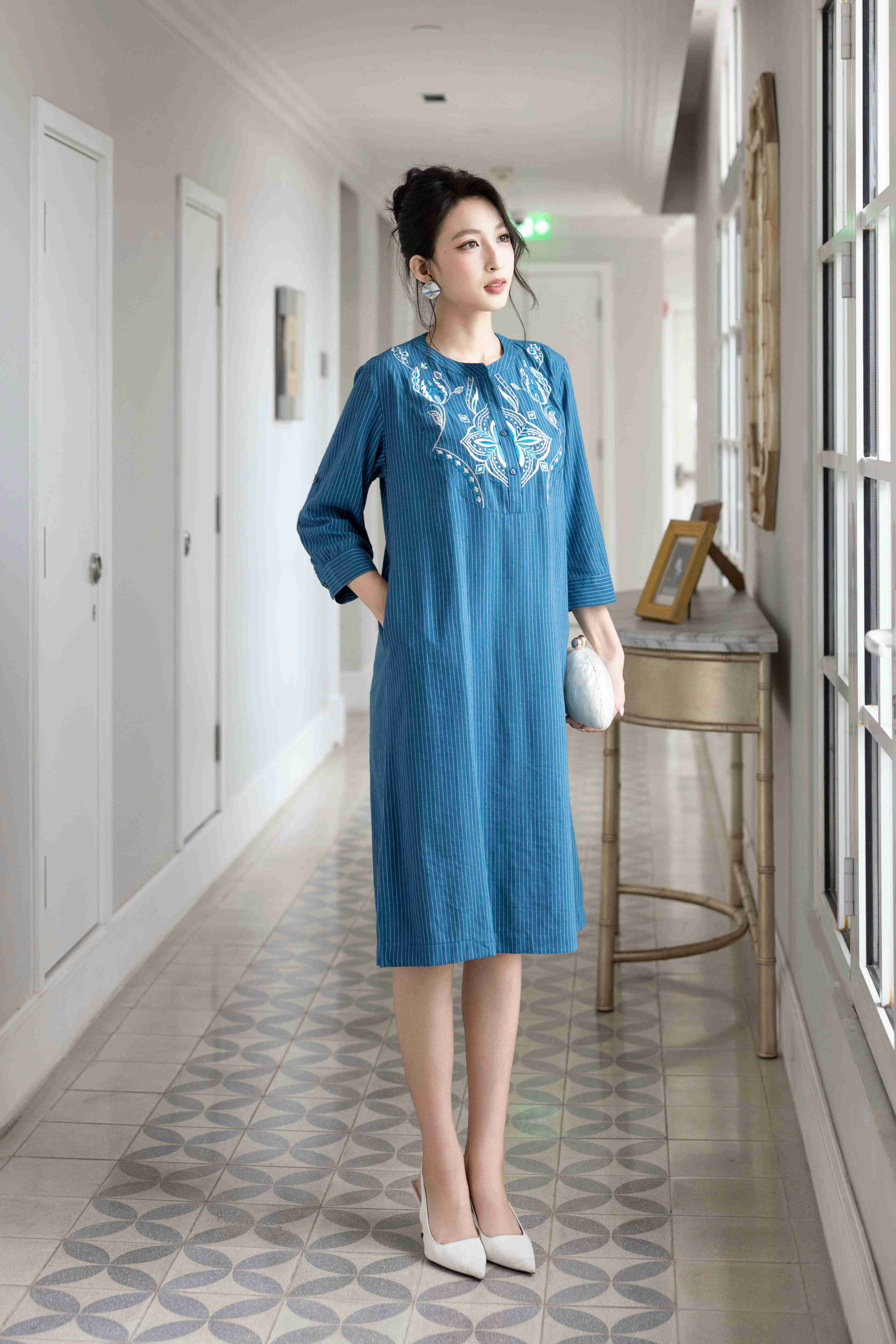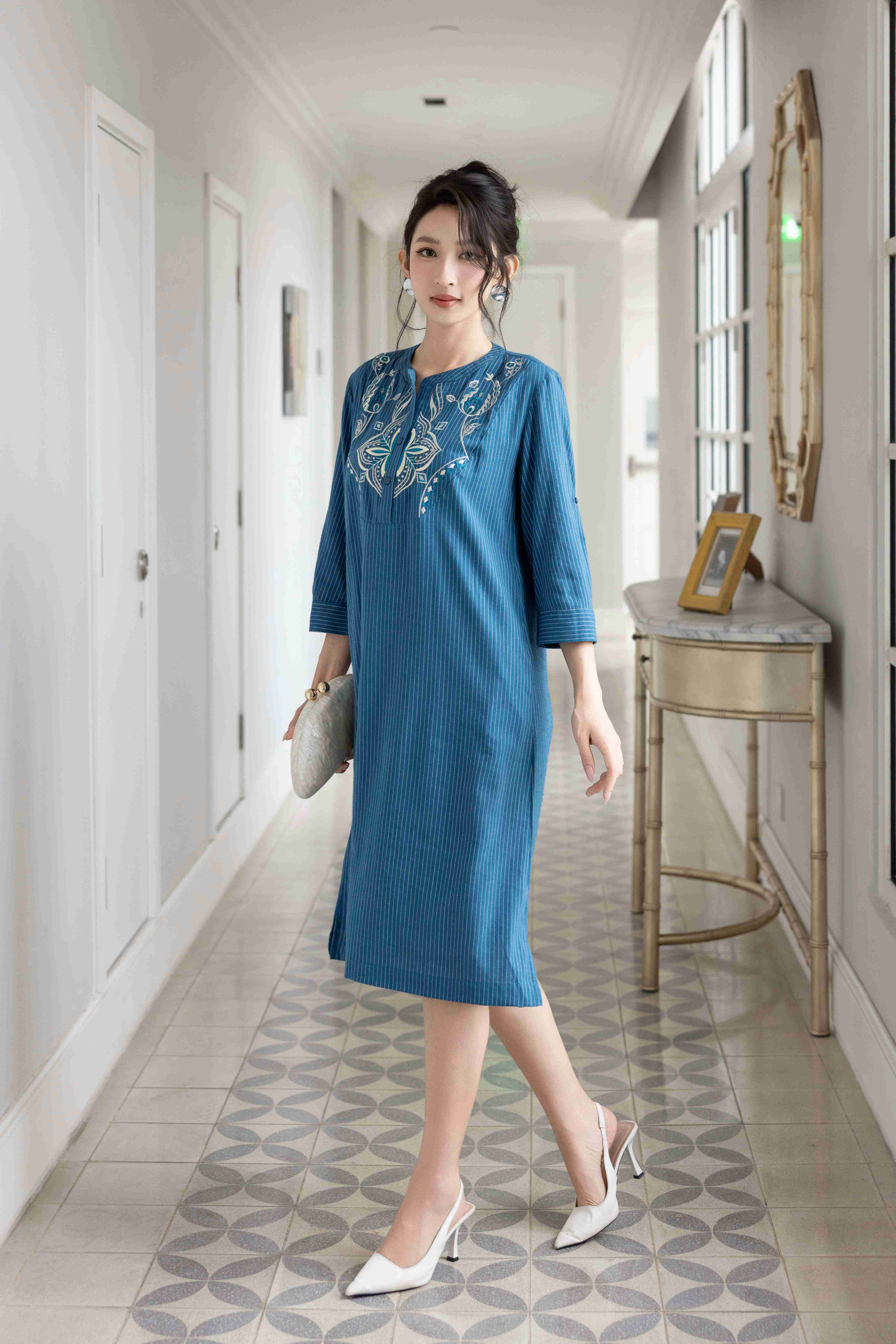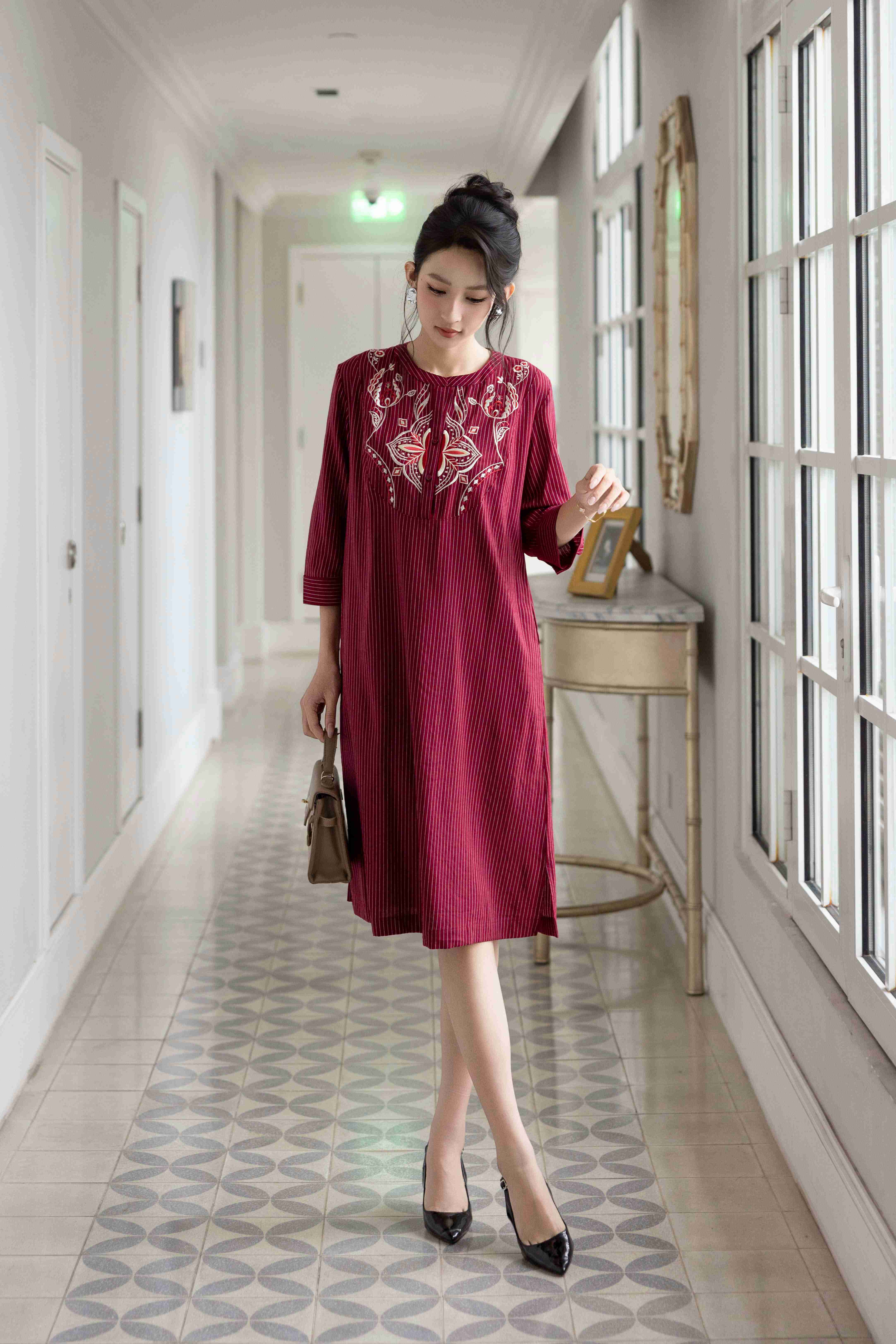SWANLAKE | Váy Đầm Nữ Suông Vải Cotton Sọc Thêu Hoa Họa Tiết Tay Lỡ Cổ Trụ Cài Nút Công Sở D13173LW01