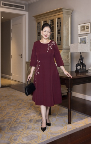 M COLLECTION | Váy Đầm Suông Nữ Trung Niên Tặng Mẹ Lụa Dày Thêu Hoa Tay Lỡ Cổ Tròn Dự Tiệc D13192LW01