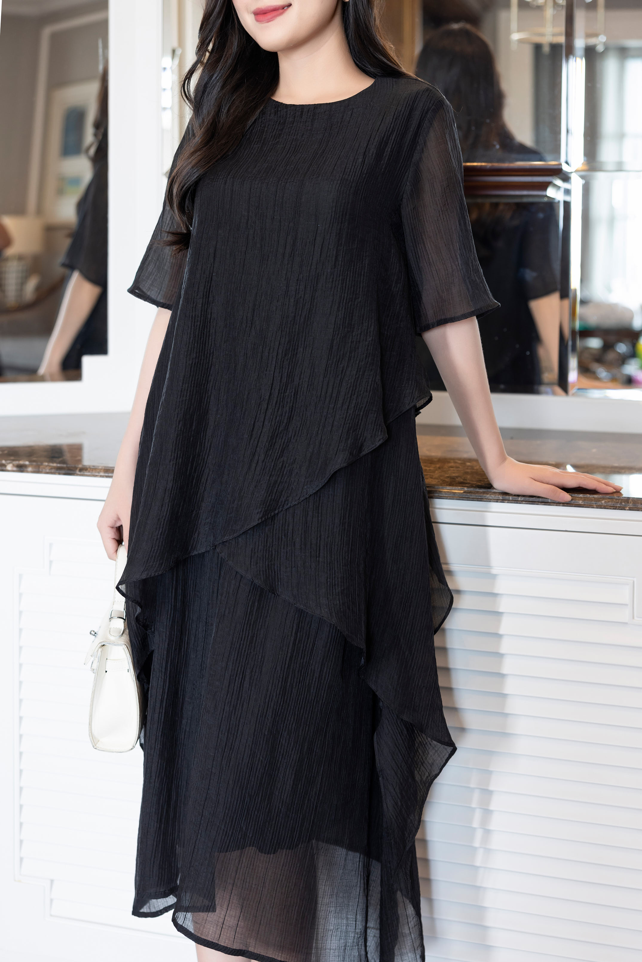 Đầm Suông Trơn Vắt Chéo Hai Lớp Chất Tơ Xốp Lót Lụa Hàn Trắng Swanlake - D12062LW01