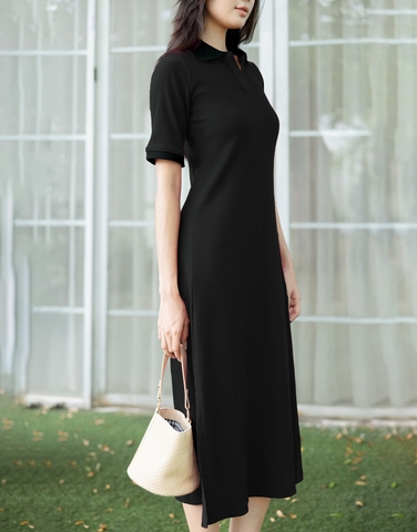 Đầm Thun Gân Tay Bo Thun Cổ Nẹp Đen Swanlake - D11408LW01
