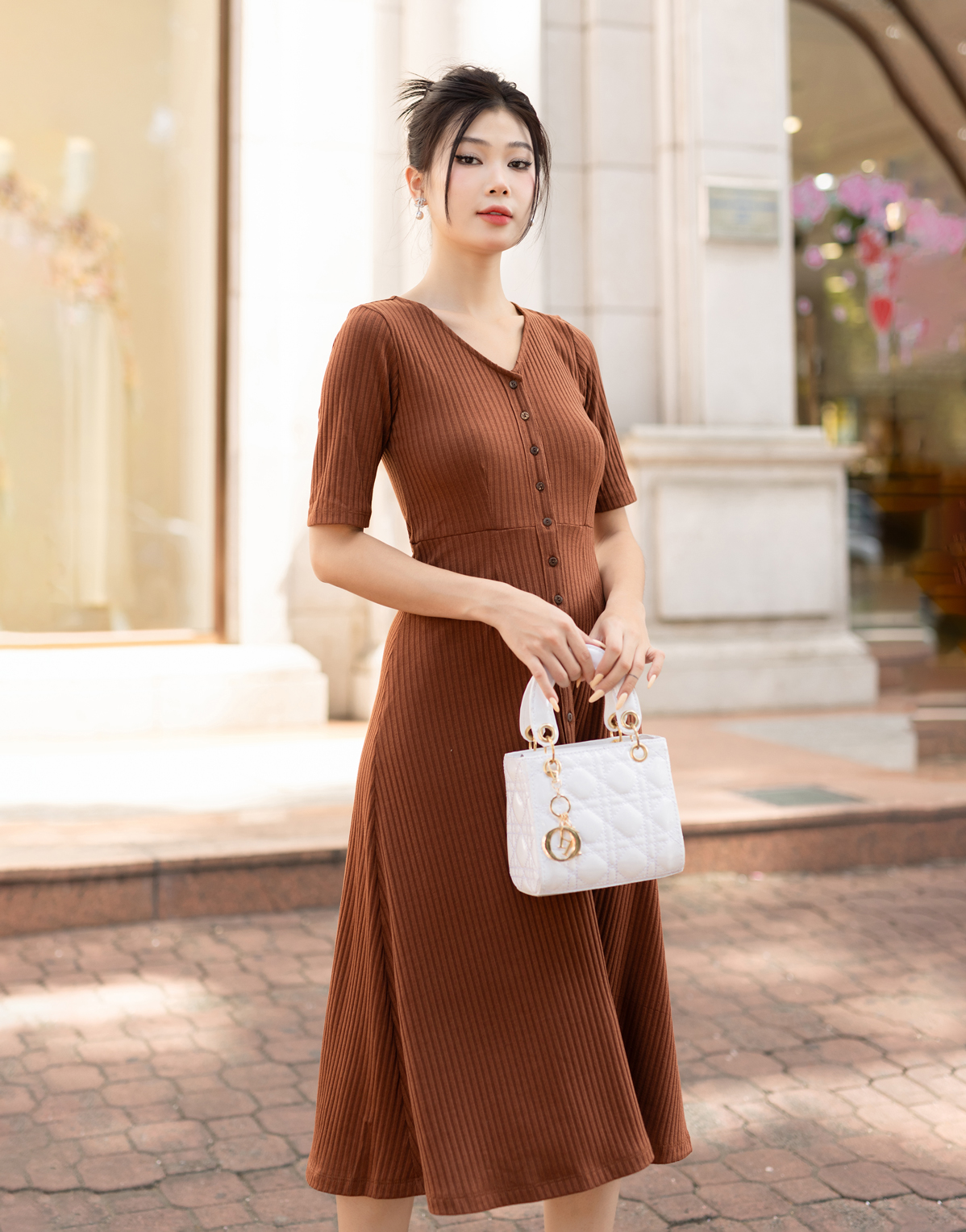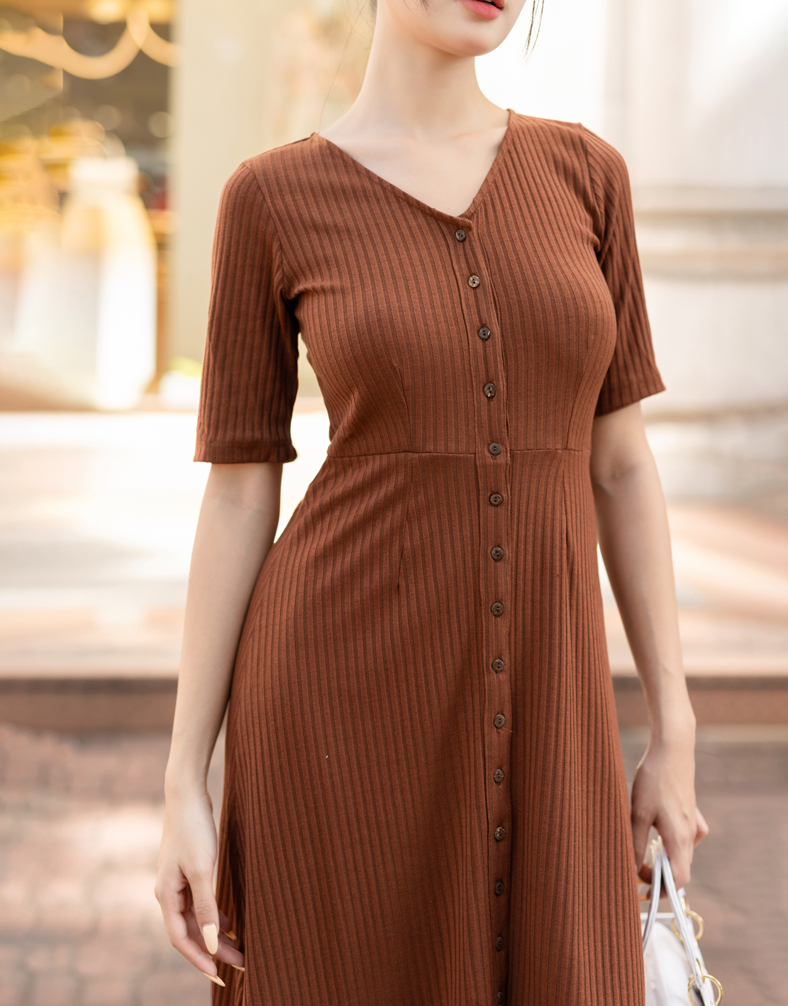 Đầm được làm từ chất thun gân cao cấp, co dãn, thấm hút và khá dày dặn, không bị nhão vải sau khi giặt. Đầm có thiết kế nút gỗ dọc thân áo, cổ V sang trọng và phần tay lỡ giúp che khuyết điểm bắp tay.