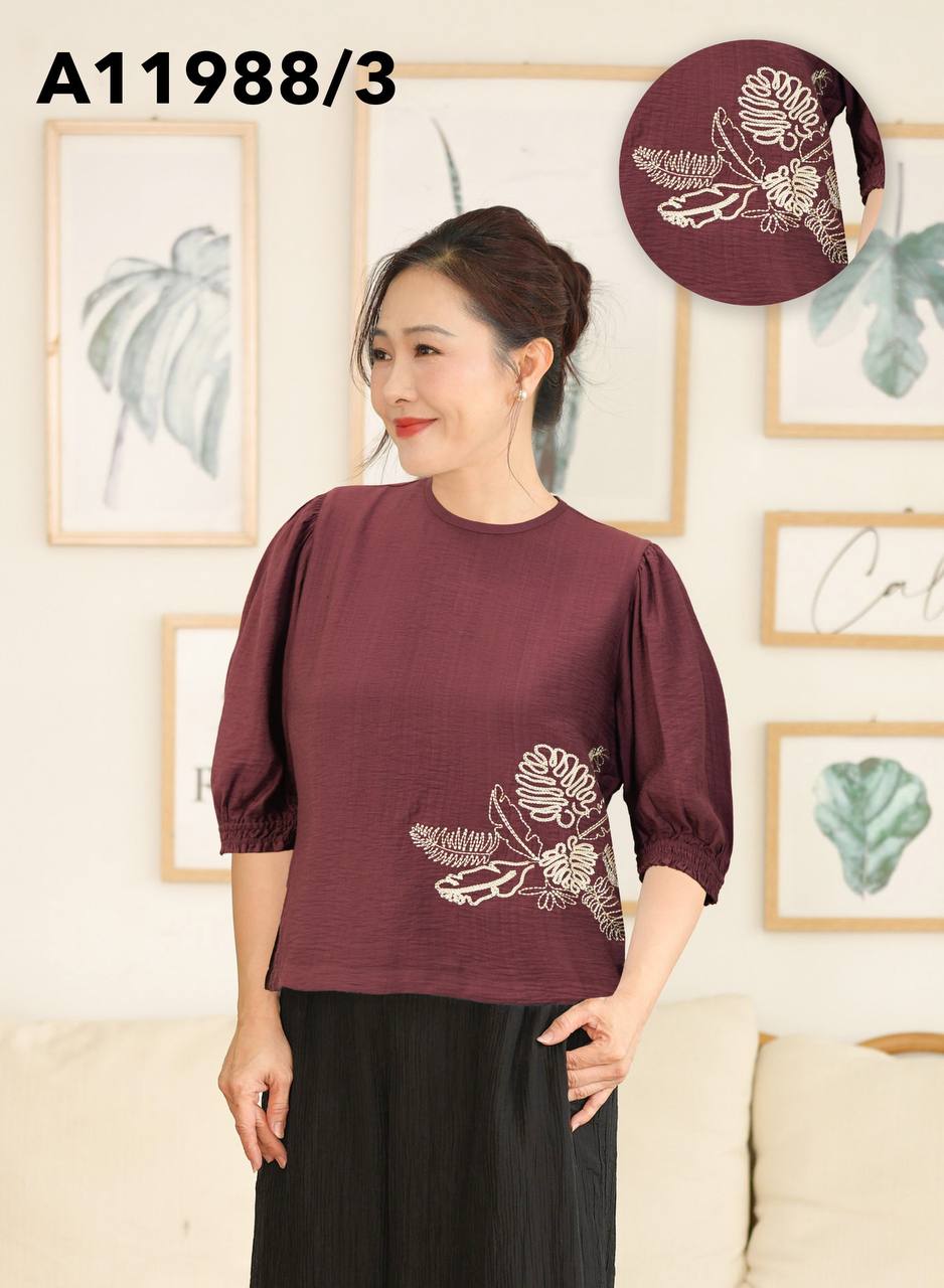 M COLLECTION | Áo Kiểu Nữ Trung Niên Tặng Mẹ, Bà Vải Lụa Thêu Hoa Hè Mát Mẻ Cổ Tròn Tay Ngắn A12296LW01