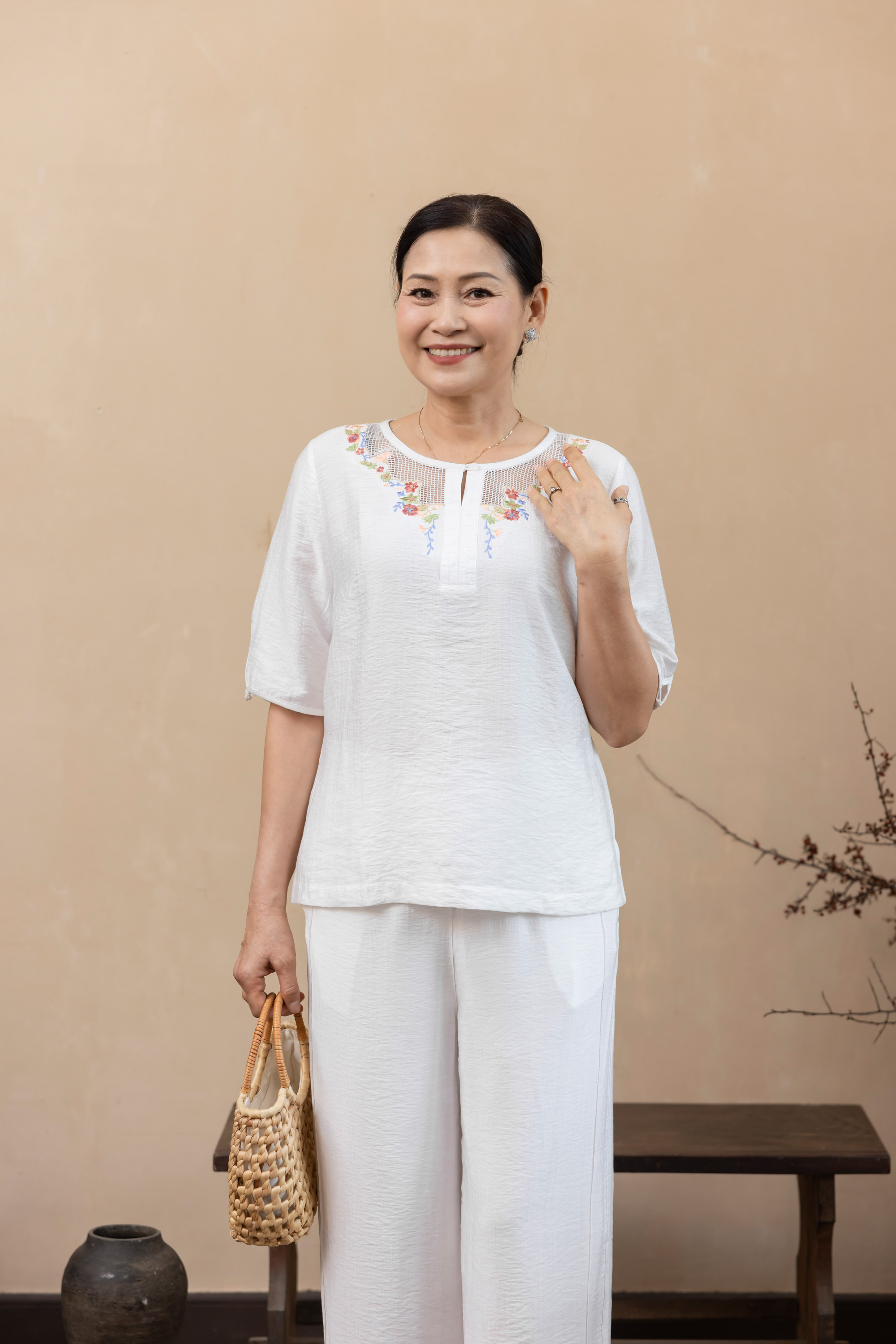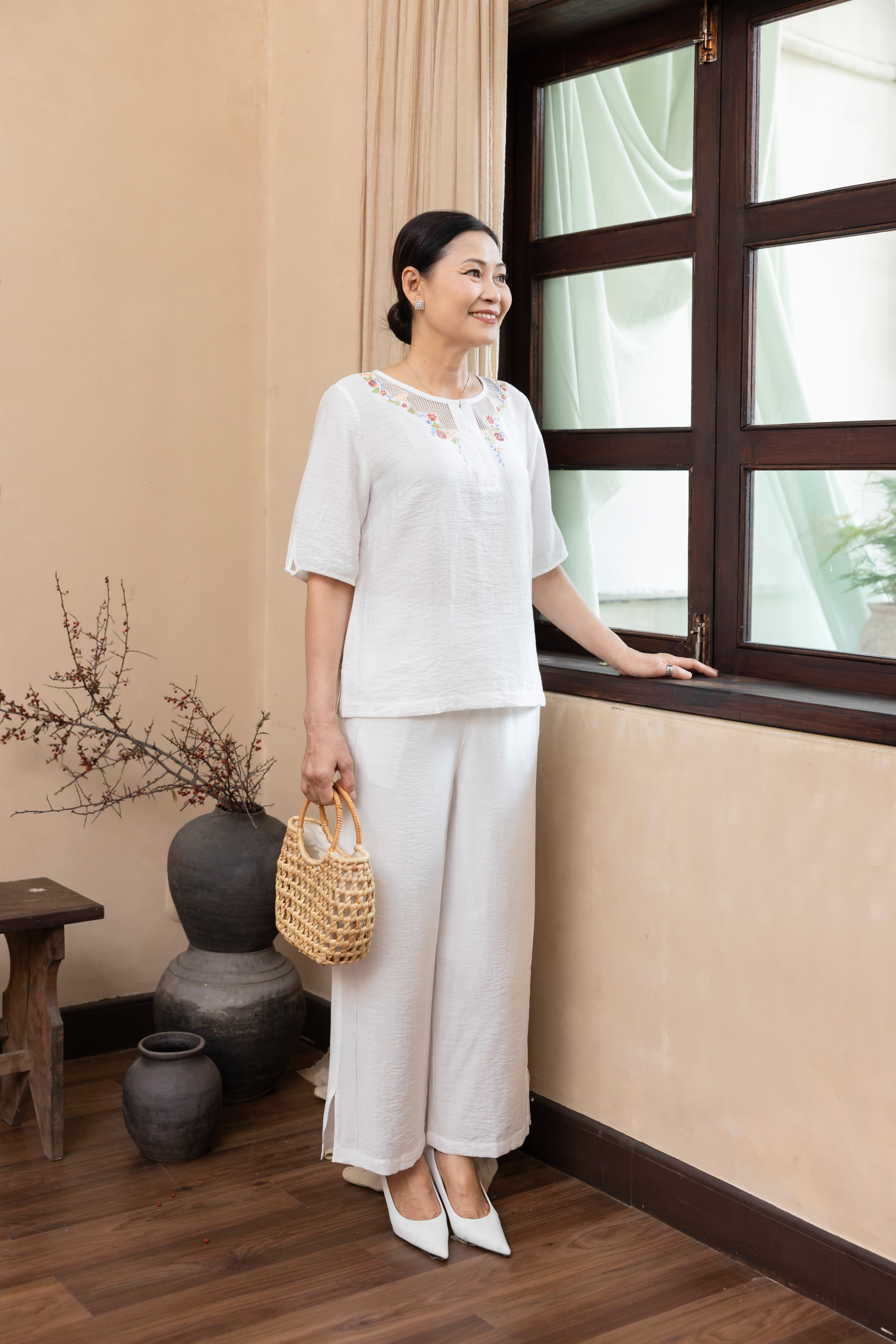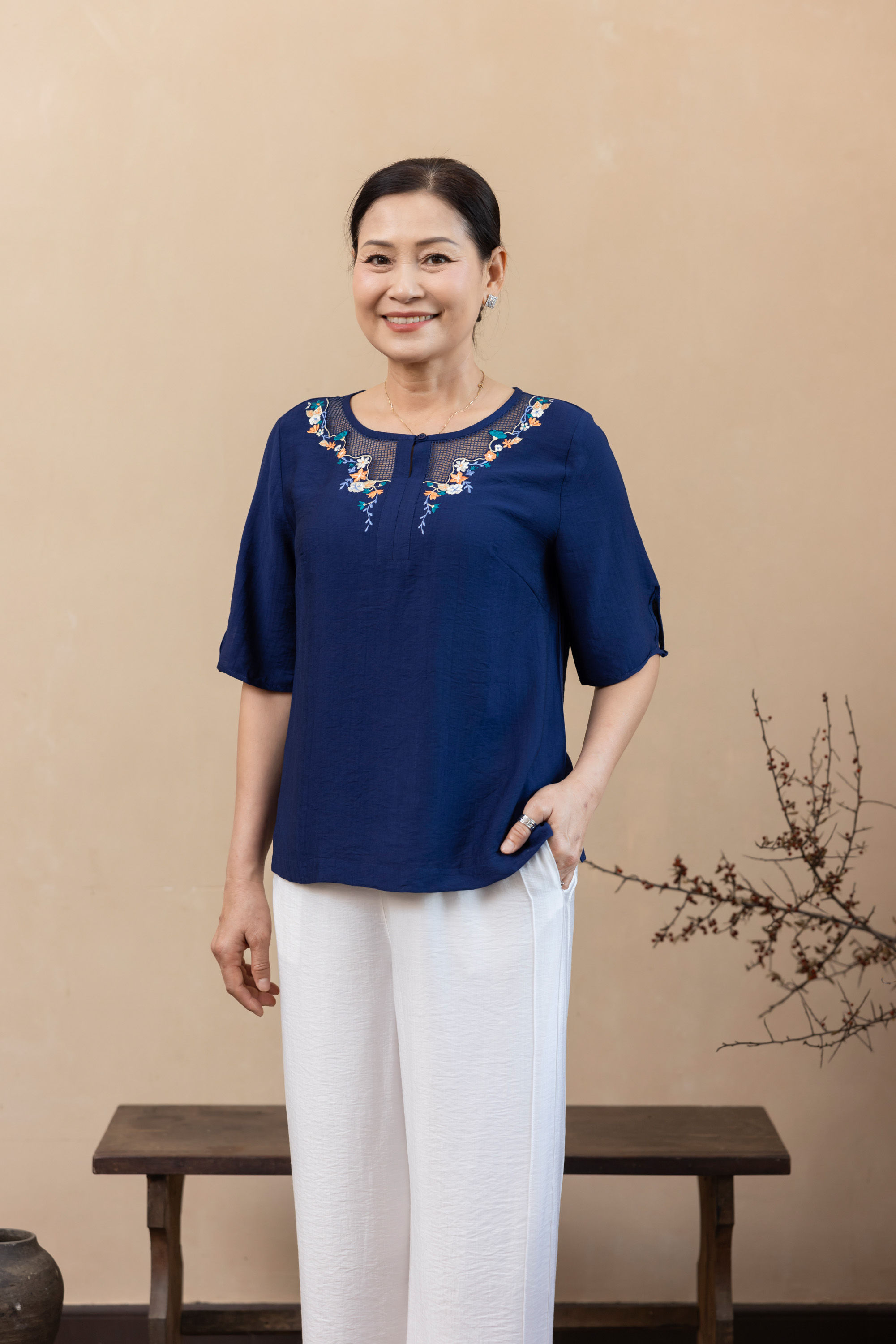 M Collection | Áo Kiểu Trung Niên Tặng Mẹ Phom Suông Cổ Tròn Thêu Hoạ Tiết Đối Xứng Phối Ren Vải Xô Chéo - A11993LW01