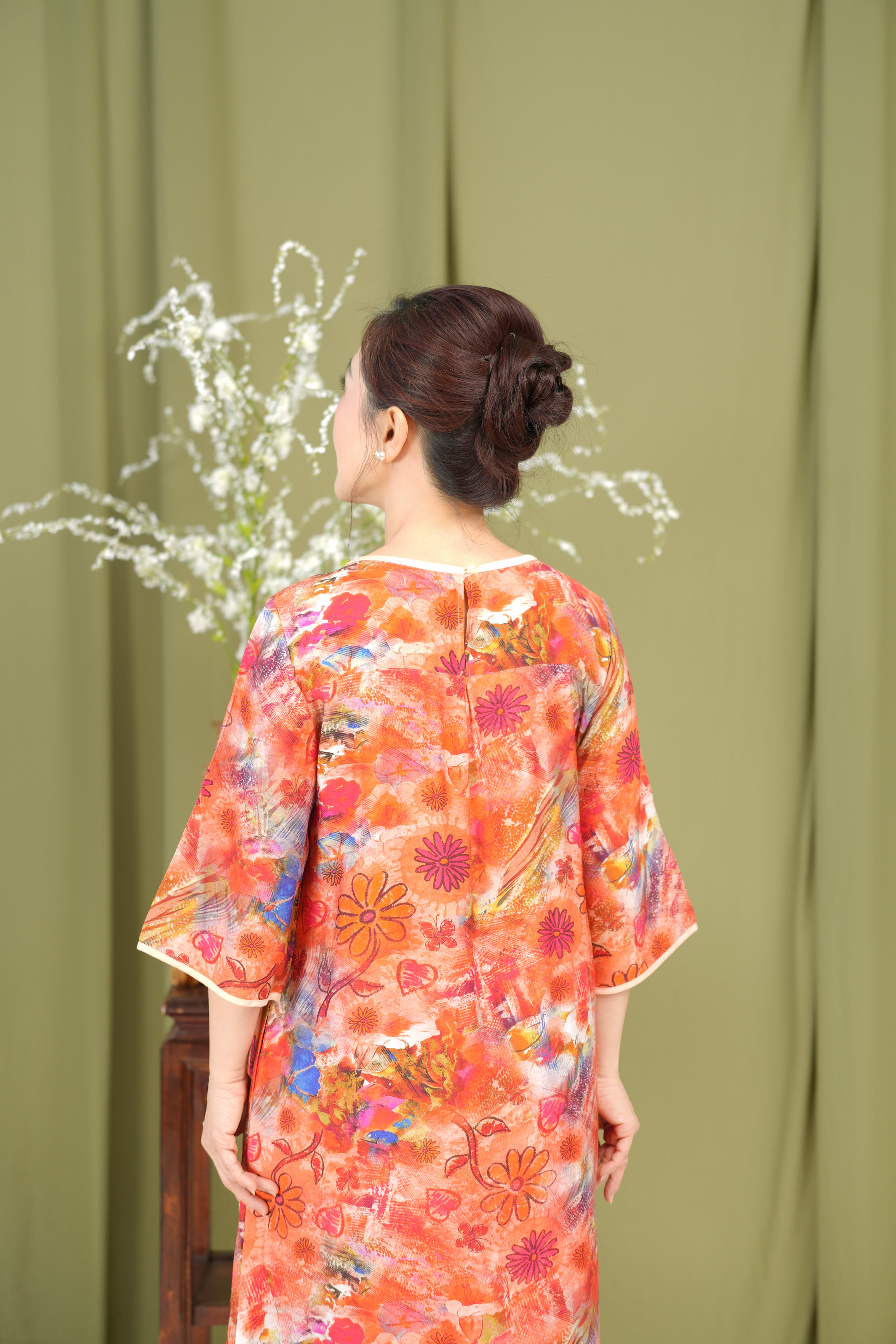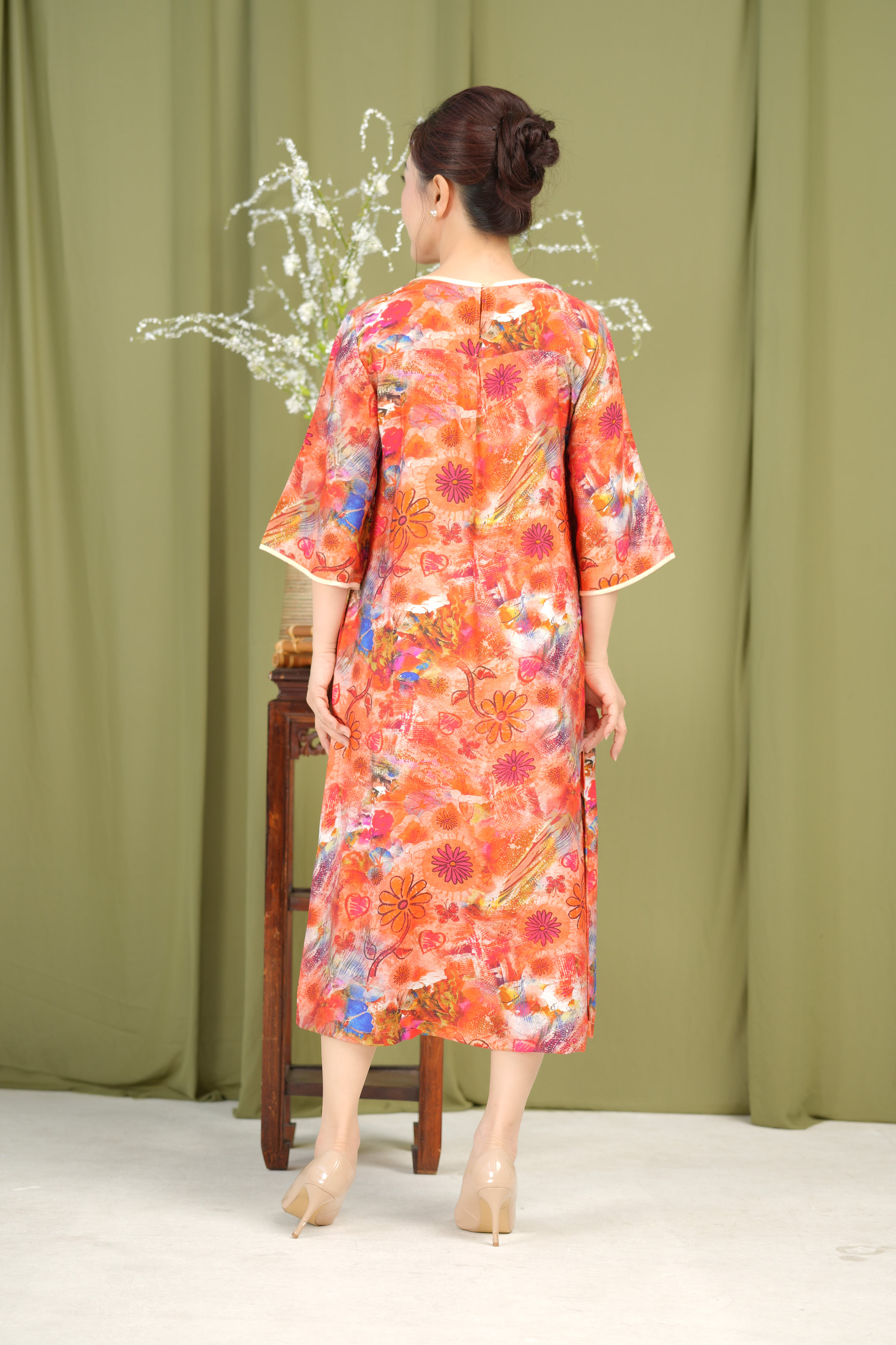 M COLLECTION | Áo Kiểu Nữ Trung Niên Tặng Mẹ Vải Lụa Mango Bông In Vệt Màu Cổ Tròn Tay Lỡ Xòe A12877LW01