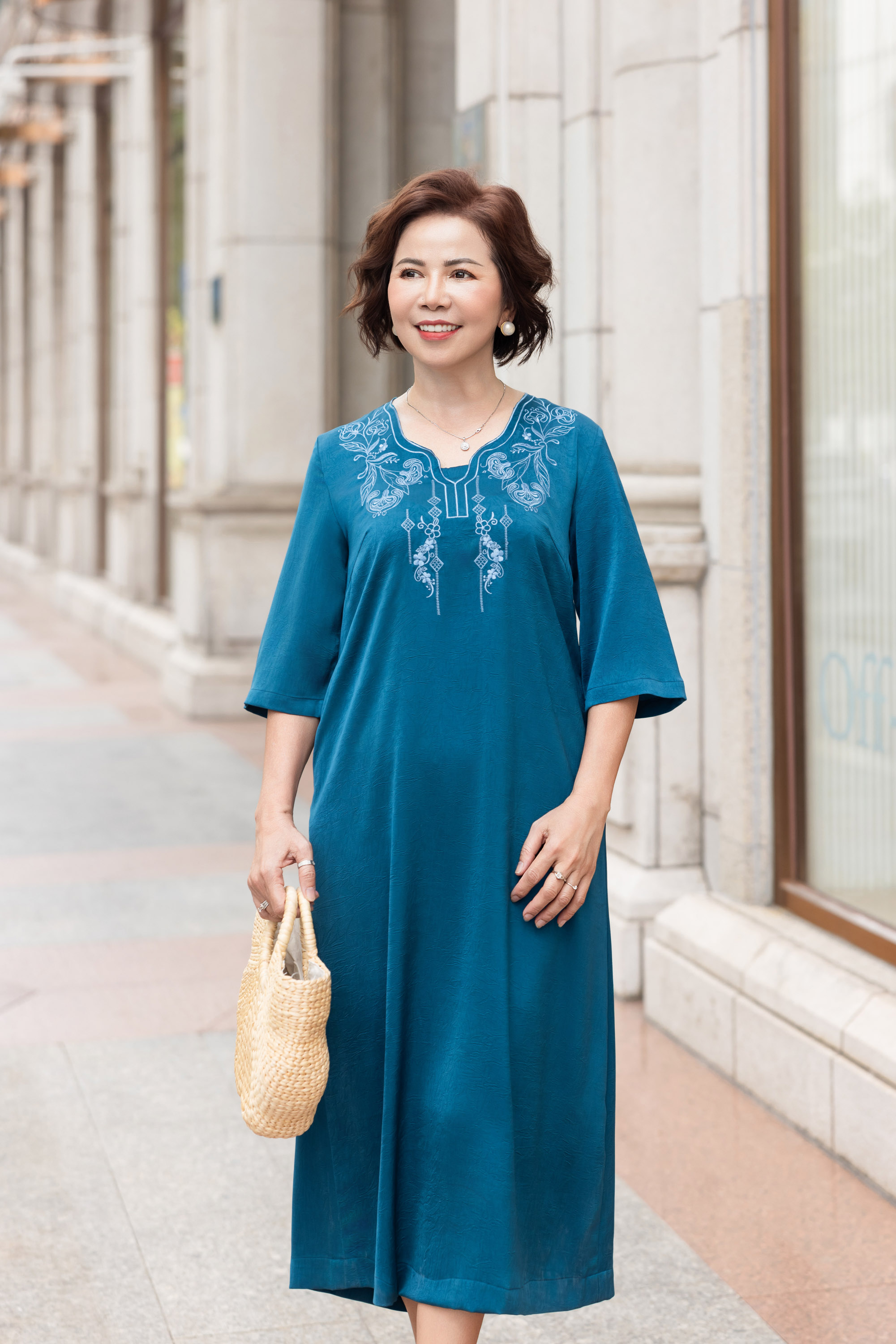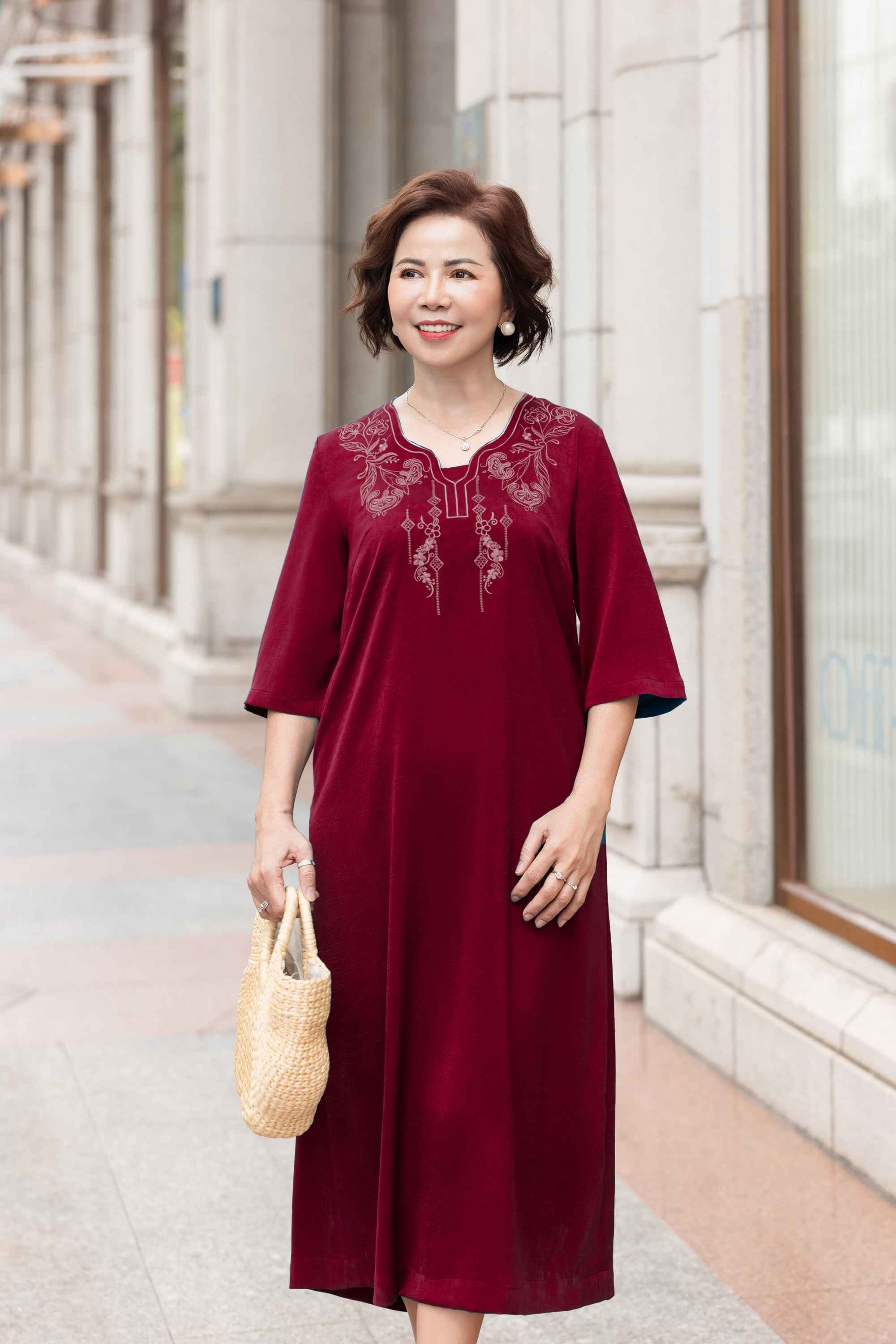 M Collection | Đầm Trung Niên Tặng Mẹ Phom Suông Dài Sang Trọng Vải Lụa Gấm Thêu Chi Tiết Viền Cổ D12387LW01