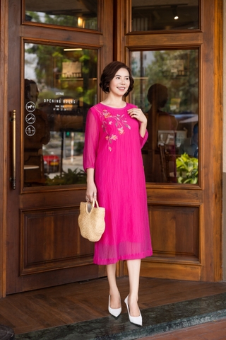 M COLLECTION | Váy Đầm Nữ Trung Niên Tặng Mẹ, Bà Suông Tơ 2 Lớp Thêu Hoa Hè Tay Lỡ Bo Chun D12317LW01