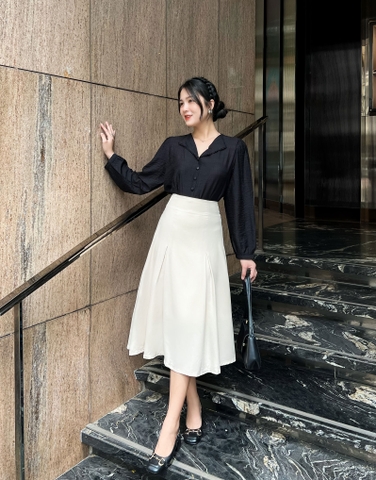 - Dáng người tam giác ngược nên mặc đồ gì: Dáng người tam giác ngược thường có đôi chân thon, hông nhỏ và vai rộng hơn hông. Vì vậy, khi phối đồ cần tạo cảm giác cân đối giữa phần thân trên và dưới. Bạn nên chọn những bộ trang phục có đường cắt dọc để tạo chiều dài cho thân hình, ví dụ như váy xòe hoặc quần tây phom dài. Ngoài ra, nên chọn các mẫu áo có cổ tròn hoặc cổ tim để tạo sự cân đối cho vai và hông. Các kiểu áo tay dài, tay phồng là chân ái với nàng vì có thể tạo được cân bằng giữa thân trên và thân dưới. Nên chọn những mẫu váy đơn giản, mềm mại, không có quá nhiều chi tiết, có phần cổ khoét sâu vừa quyến rũ lại giảm bớt ánh nhìn vào phần vai rộng